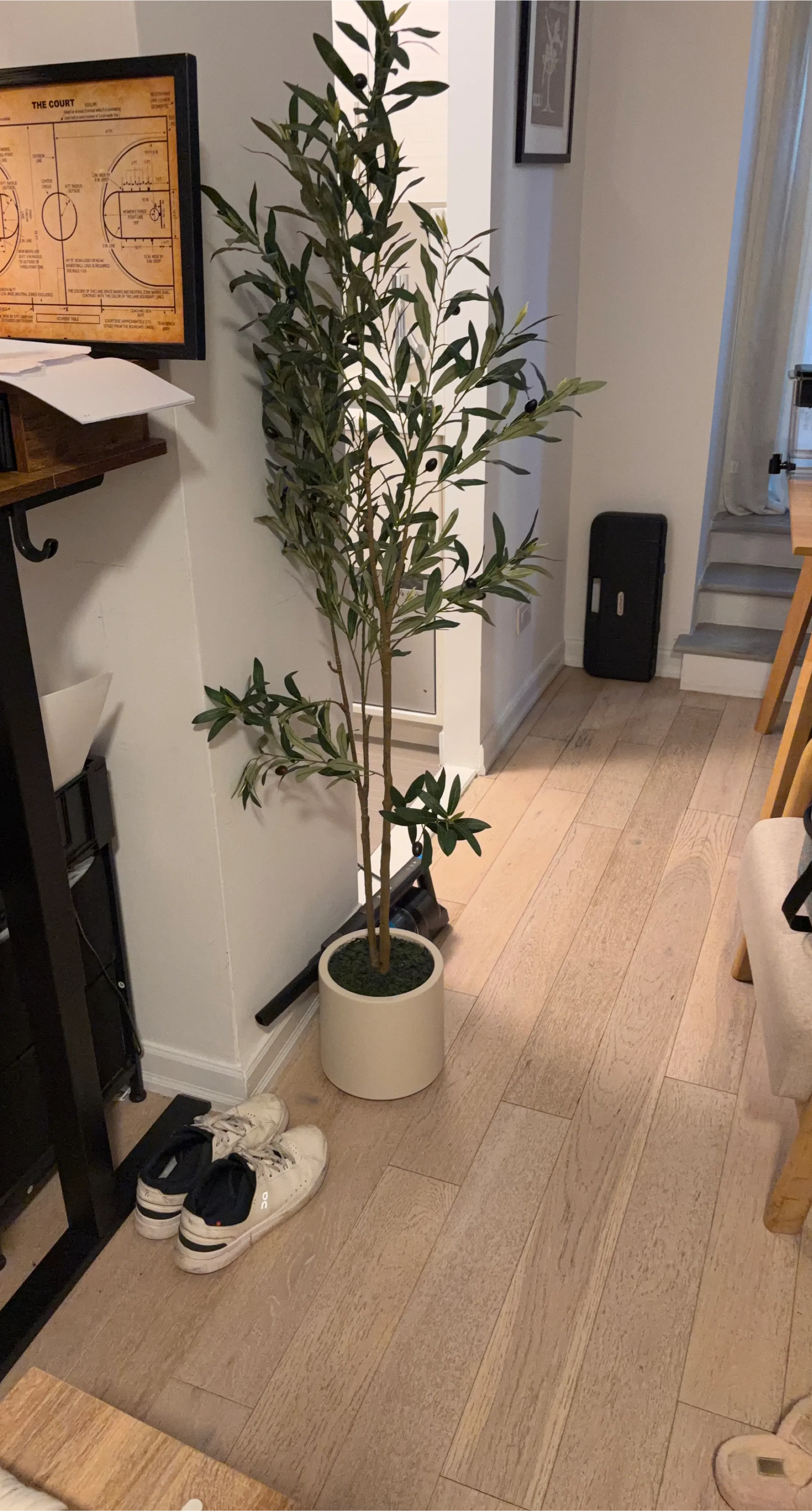 This is a tall, artificial olive tree plant in a cream-colored pot. It has realistic green leaves and black olives, bringing a touch of Mediterranean charm to your space. The plant stands potted and ready to place.