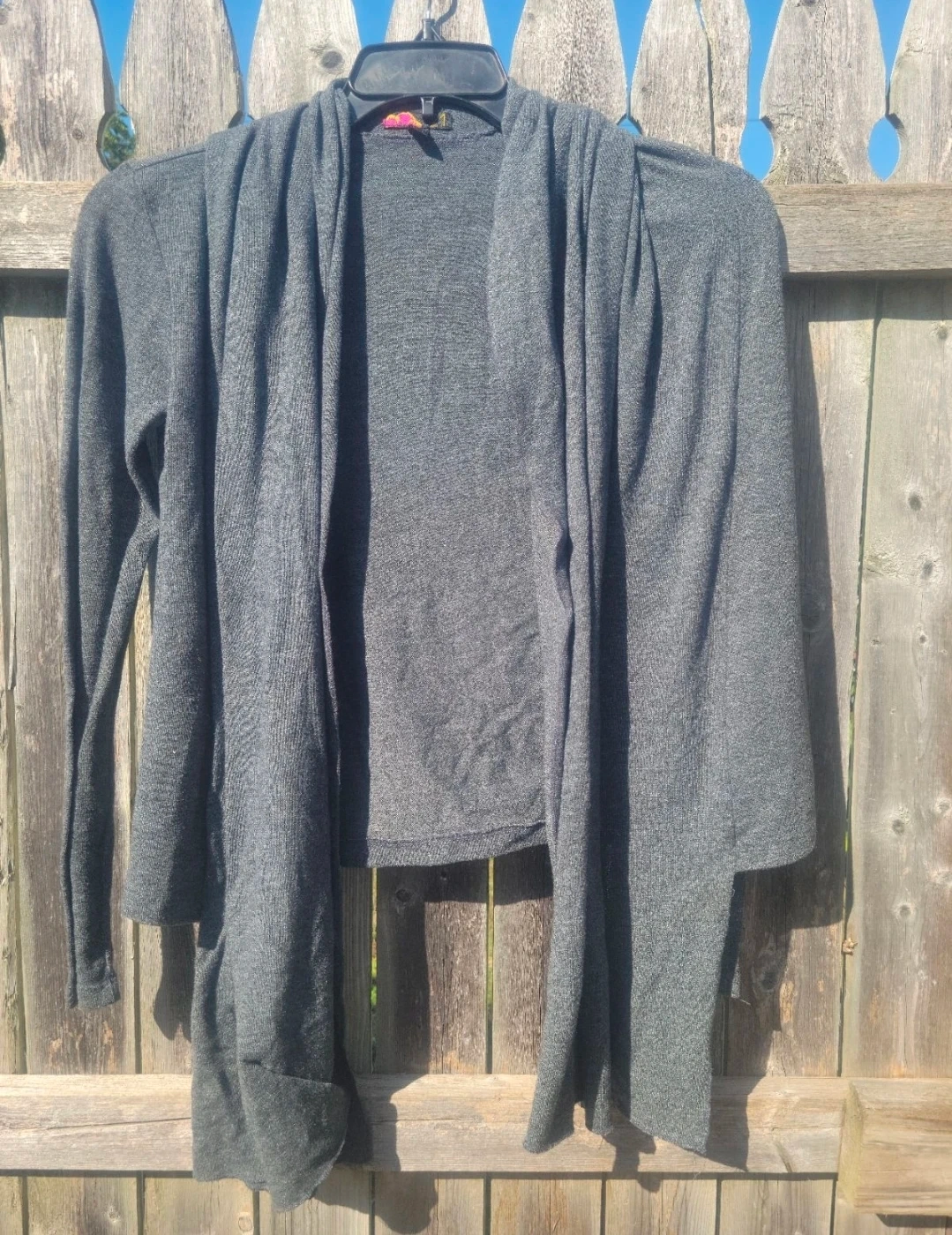 A comfortable gray cardigan sweater with long sleeves and a waterfall front. This knit sweater is made of a soft, stretchy material. It's perfect for layering over tops for a casual look.