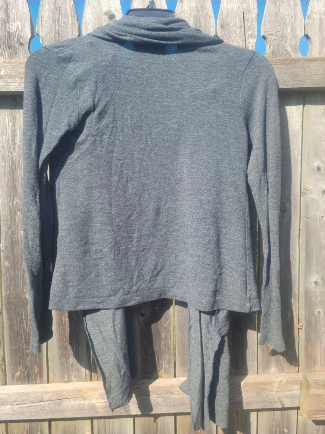 A comfortable gray cardigan sweater with long sleeves and a waterfall front. This knit sweater is made of a soft, stretchy material. It's perfect for layering over tops for a casual look.