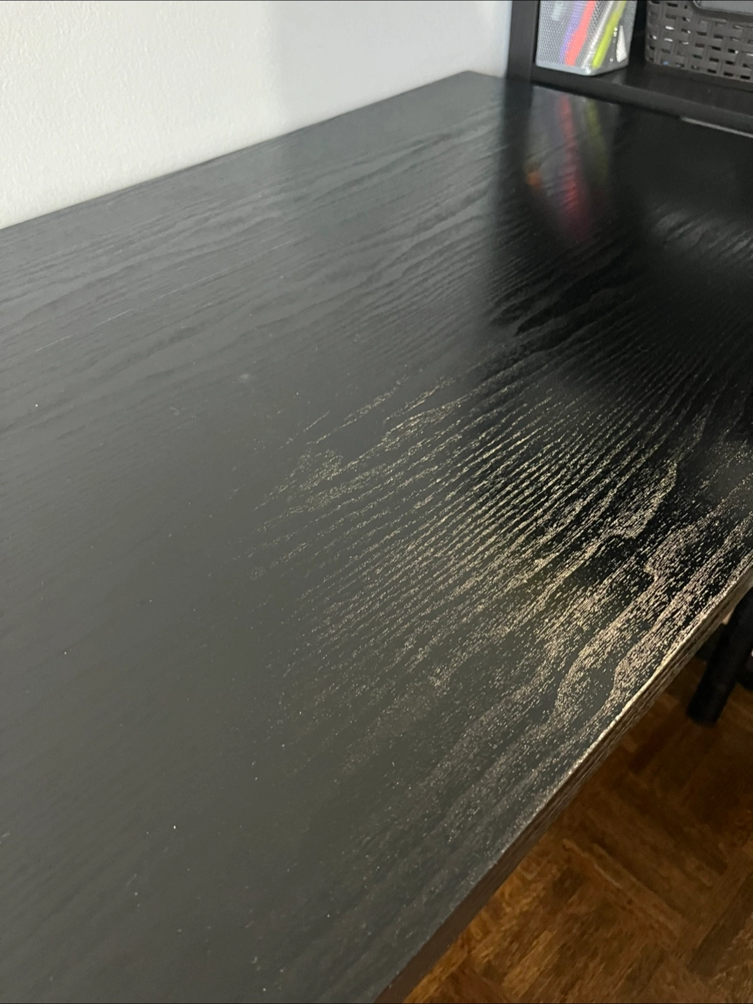 Black Ikea desk. Coated with a black textured high quality adhesive that can be removed to reveal a white color on top and legs. In great condition.