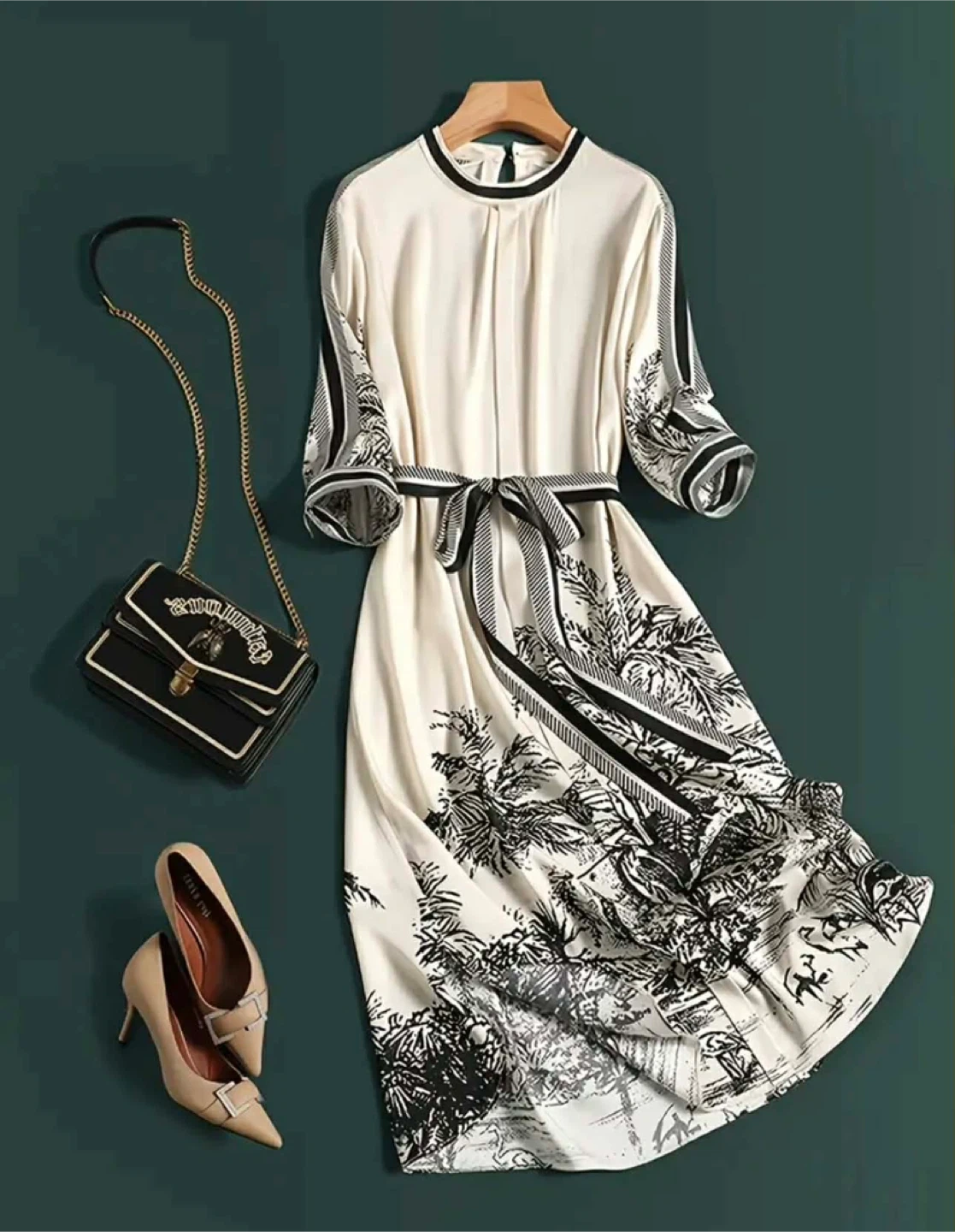 Cream midi dress with a striking black tropical print. It features a flattering tie-waist and elegant long sleeves. Fabric has a nice drape.