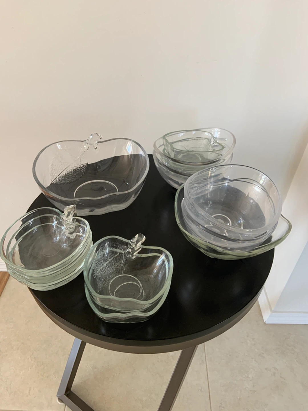 Here's a set of six clear glass bowls shaped like apples. They have a delicate leaf etching on the inside and a small glass stem detail on the rim. Perfect for serving snacks or small desserts!