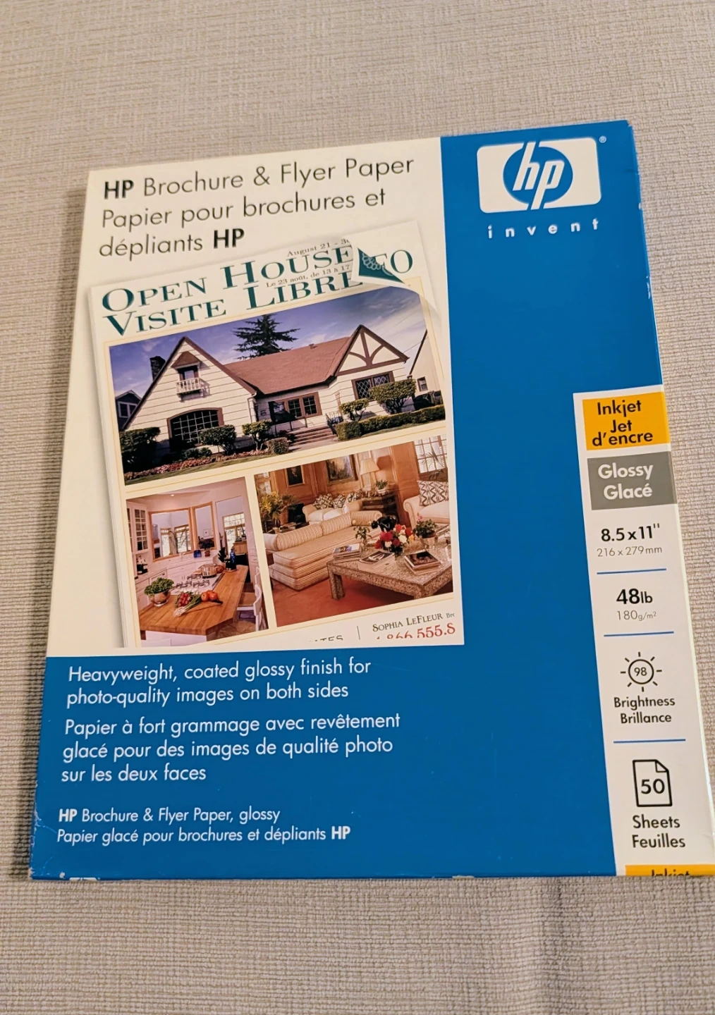 HP Brochure & Flyer Paper, glossy finish. It's 48lb and 103 brightness. This heavyweight, coated paper is good for photo-quality images on both sides. Suitable for professional, two-sided brochures, flyers and marketing materials.