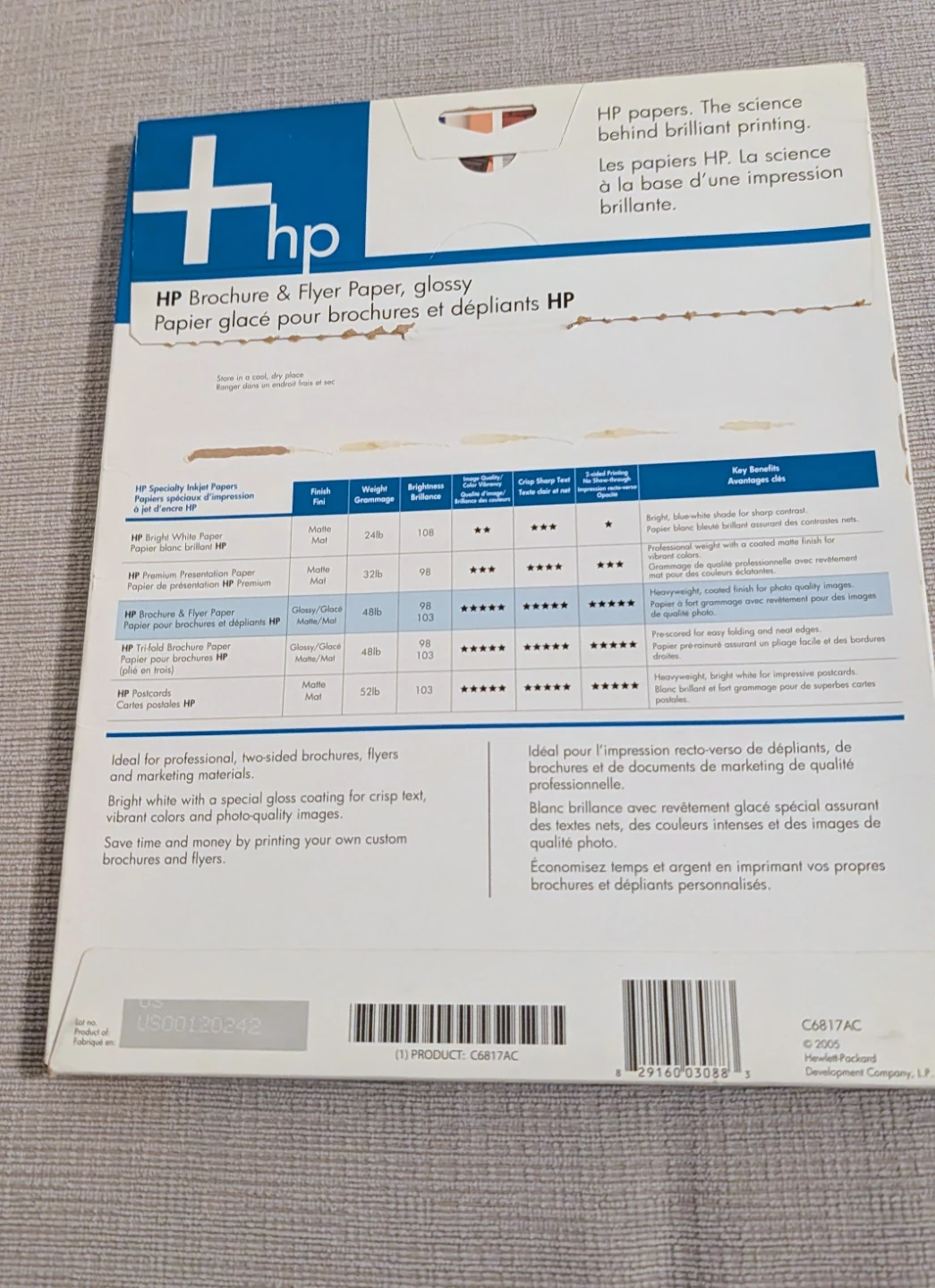 HP Brochure & Flyer Paper, glossy finish. It's 48lb and 103 brightness. This heavyweight, coated paper is good for photo-quality images on both sides. Suitable for professional, two-sided brochures, flyers and marketing materials.