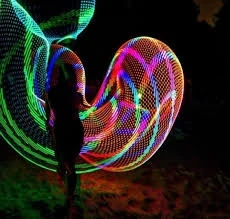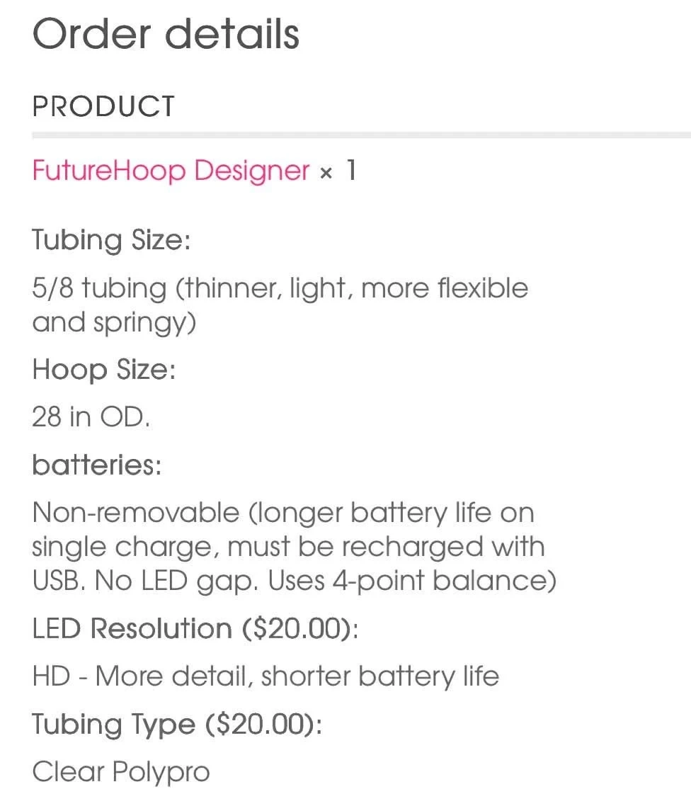 This is a FutureHoop Designer LED hoop. Tubing is 5/8 inch, offering flexibility and springiness. It measures 28 inches in outer diameter. The hoop has non-removable batteries, rechargeable via USB, and uses a 4-point balance. The LED resolution is HD for more detail and shorter battery life. Tubing type is Clear Polypro.