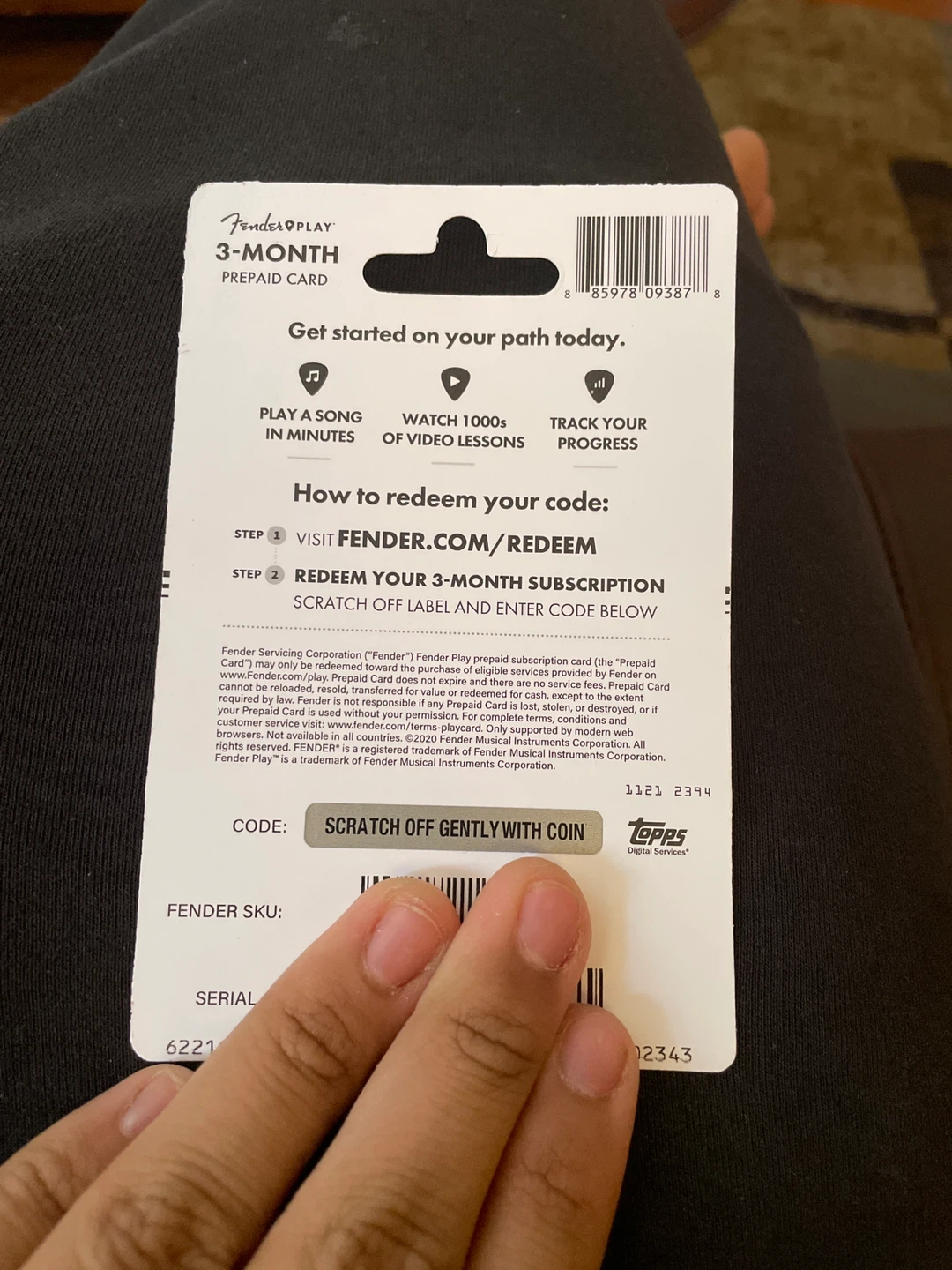 Get 3 months of free online guitar lessons with this Fender Play prepaid card. Redeem your 3-month subscription by visiting fender.com/redeem and scratching off the label to reveal your code. The card offers access to learn songs, watch video lessons, and track your progress.