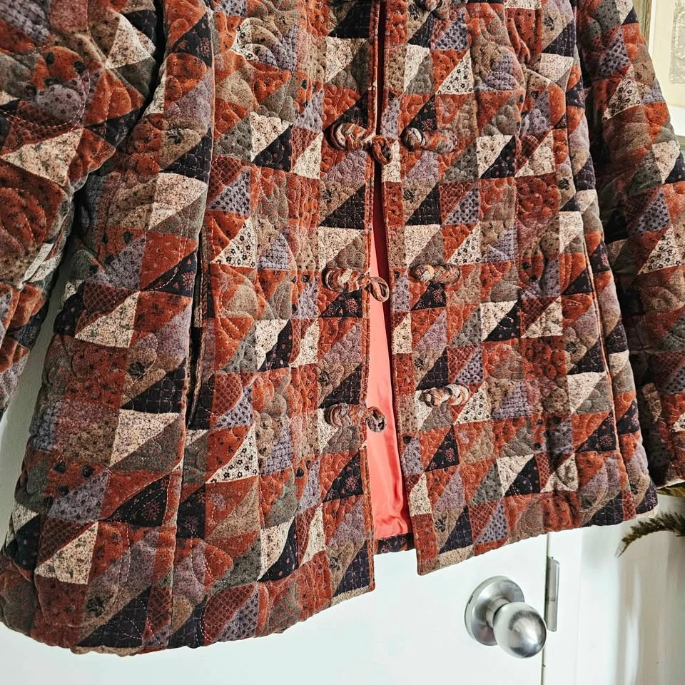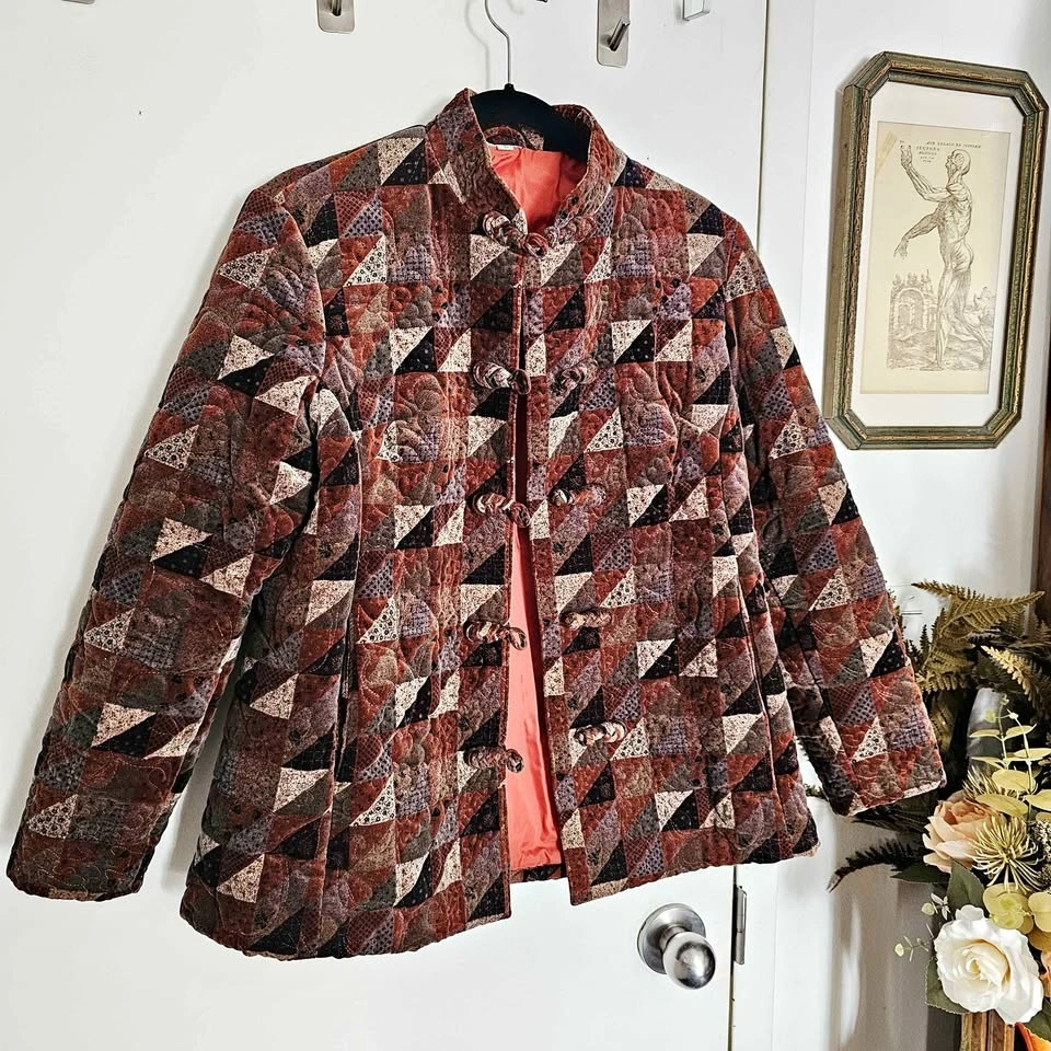vintage quilted jacket, patchwork coat, boho jacket, frog closure jacket, chinese inspired jacket, 90s vintage coat, cottagecore outerwear, art to wear, padded jacket, hong kong vintage, geometric patchwork, folk style jacket, earthy neutrals, goblincore, dark cottagecore, art teacher aesthetic