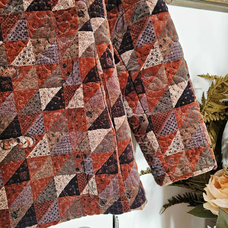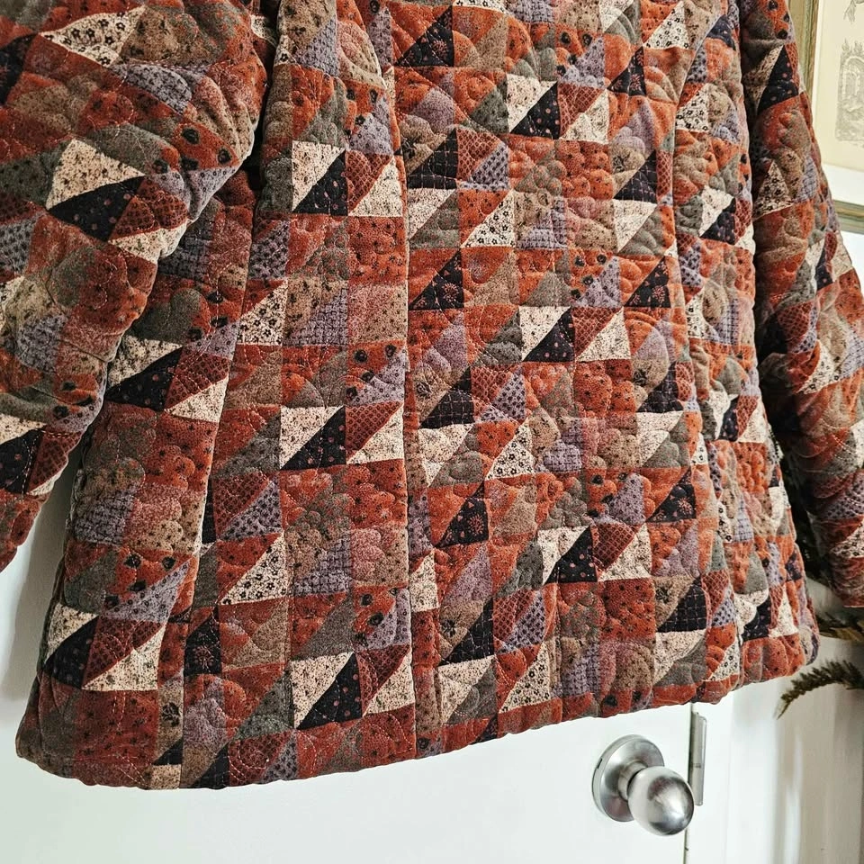 Beautiful vintage late 80s/ early 90s quilted velvet jacket, featuring a geometric patchwork-style pattern in warm earth tones of rust reddish brown, brown, black, and beige. It is made with a luxe and soft short-pile velvet and lightly padded for cozy layering.