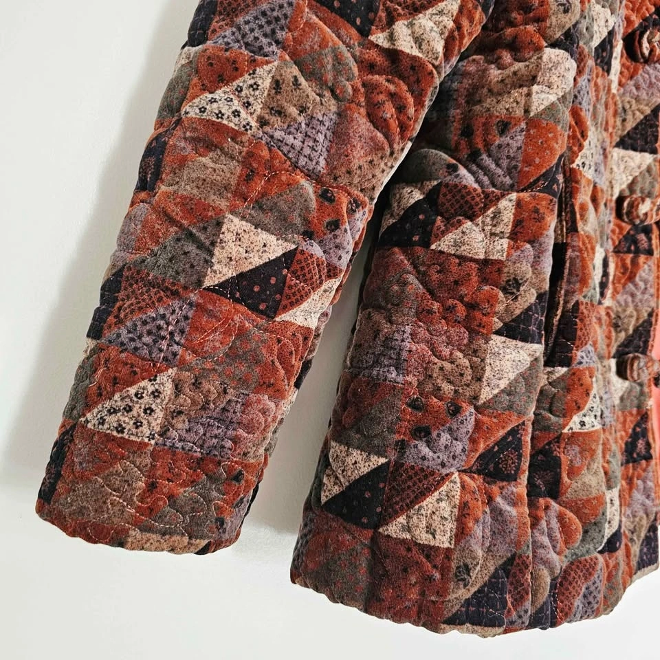 Beautiful vintage late 80s/ early 90s quilted velvet jacket, featuring a geometric patchwork-style pattern in warm earth tones of rust reddish brown, brown, black, and beige. It is made with a luxe and soft short-pile velvet and lightly padded for cozy layering.