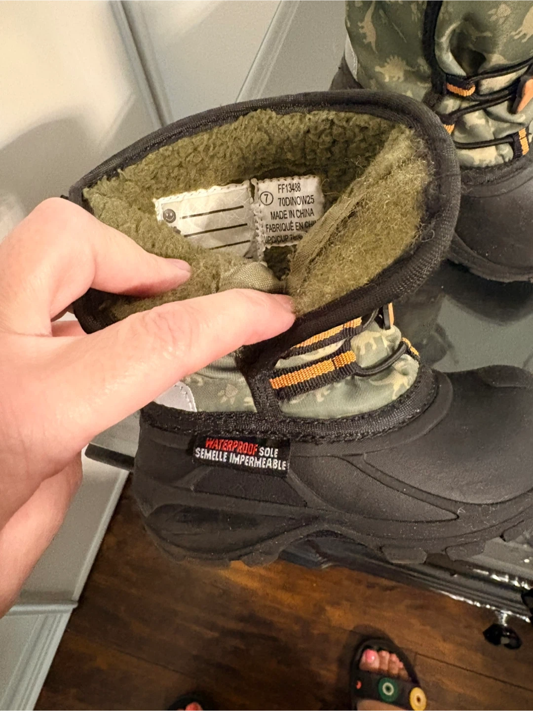 These kids' winter boots feature a fun dinosaur pattern in green camouflage. They're waterproof with a rubber sole and warm sherpa lining inside. Perfect for keeping little feet dry and cozy on cold days!