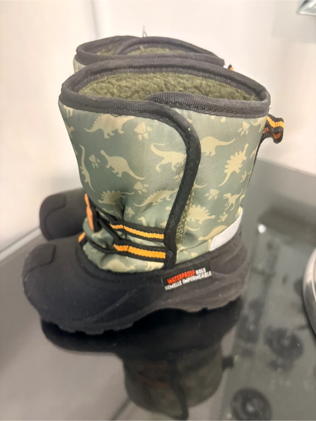 These kids' winter boots feature a fun dinosaur pattern in green camouflage. They're waterproof with a rubber sole and warm sherpa lining inside. Perfect for keeping little feet dry and cozy on cold days!