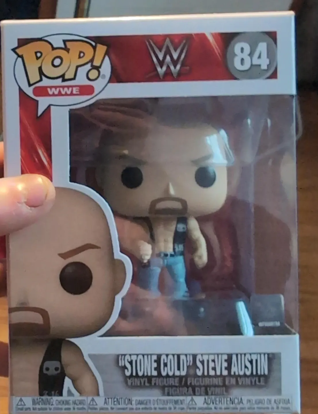 This is a Funko Pop! vinyl figure of "Stone Cold" Steve Austin, number 84 in the WWE series. It's still in its original packaging.