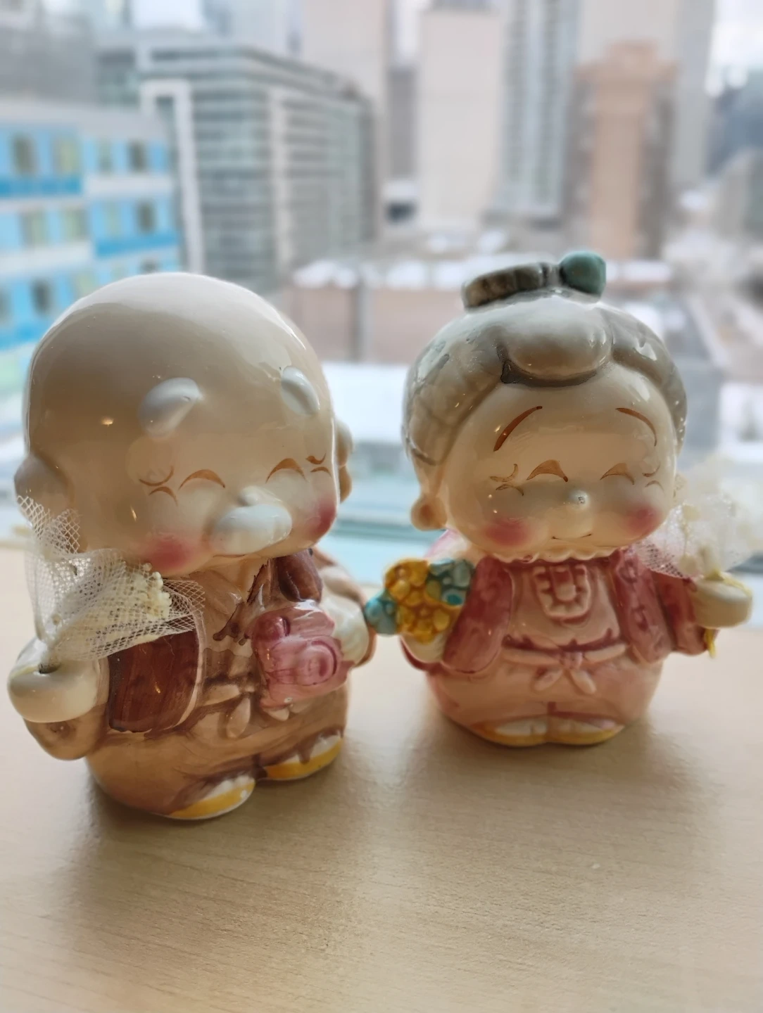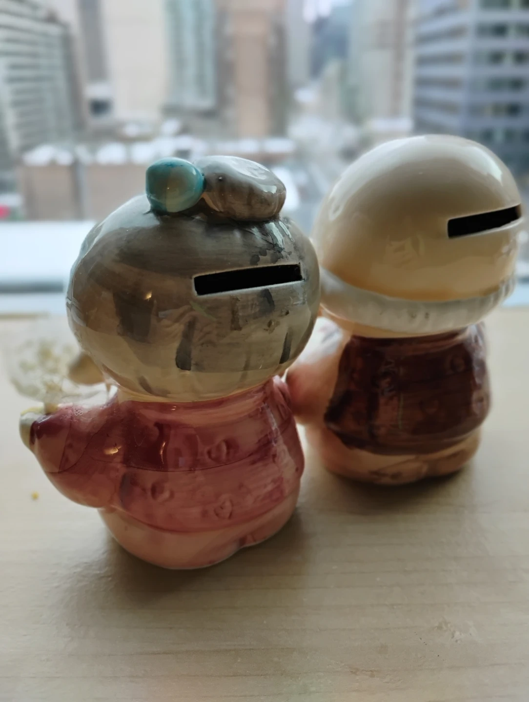 A cute pair of ceramic piggy banks shaped like a couple. They are about 5 in tall.