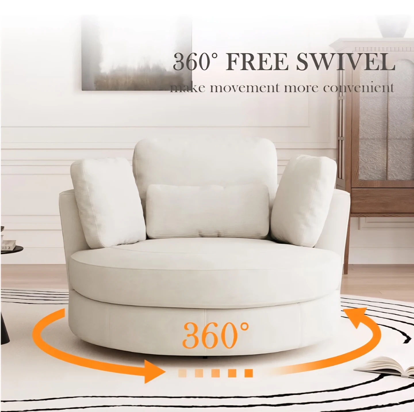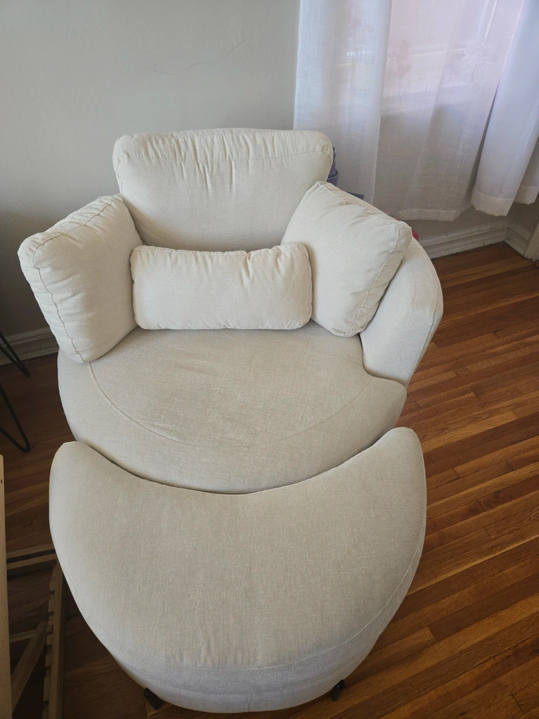 Selling a comfy swivel barrel chair with an ottoman. It's in great condition and ready for a new home! The chair features a 360° free swivel, making movement more convenient. It also has a weight capacity of 500lbs. Dimensions are included in the photos.