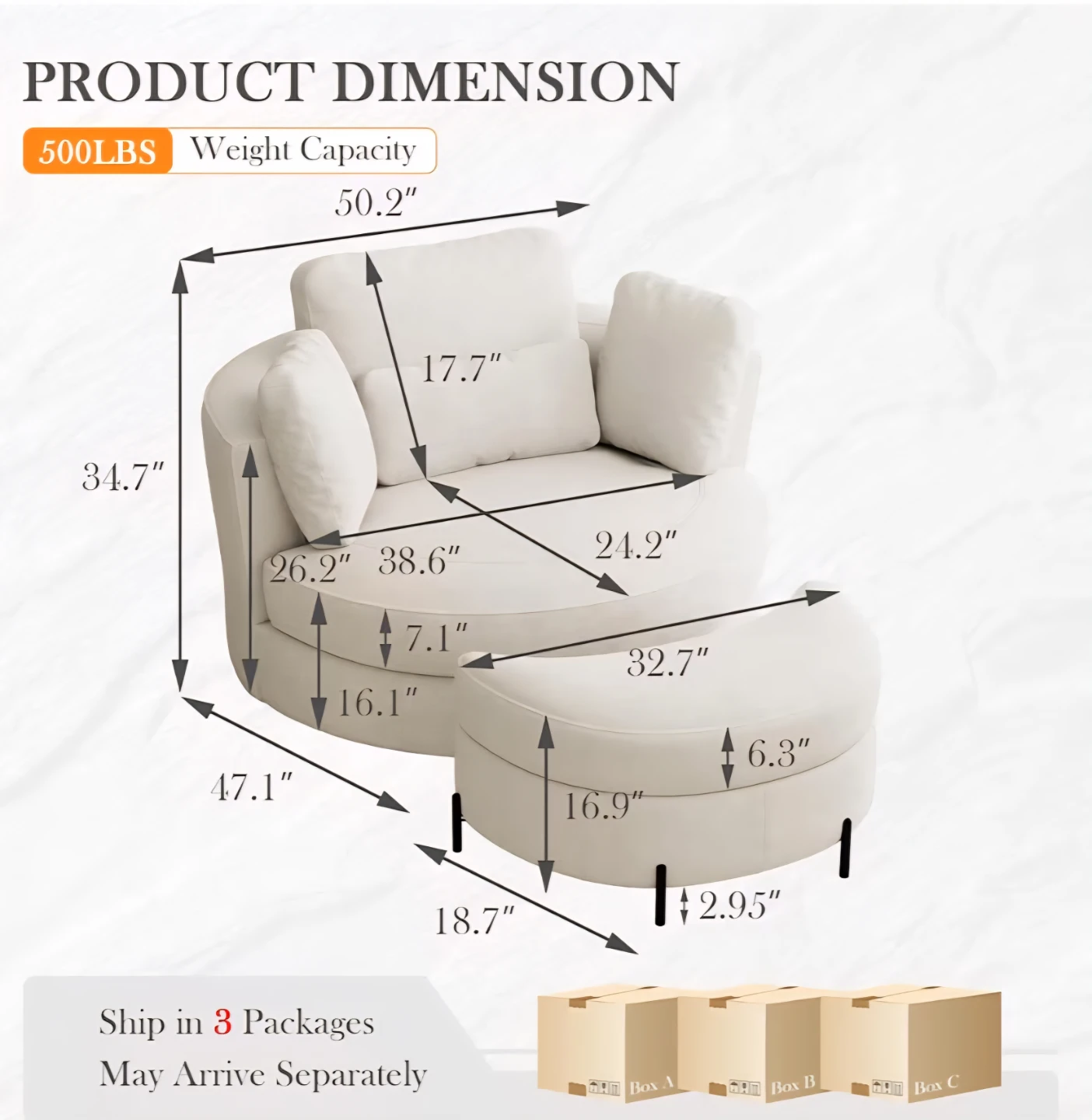 Selling a comfy swivel barrel chair with an ottoman. It's in great condition and ready for a new home! The chair features a 360° free swivel, making movement more convenient. It also has a weight capacity of 500lbs. Dimensions are included in the photos.