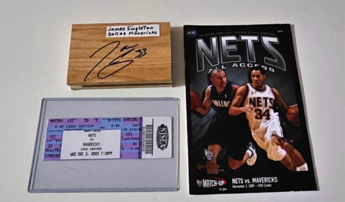 The items are a basketball floorboard by player James Singleton of the Dallas Mavericks, an unsigned ticket and program from the Nets vs. Mavericks game, making it a unique piece of sports memorabilia for fans of basketball and the NBA. Perfect for displaying or preserving, this item would be a valuable addition to any sports memorabilia collection.
