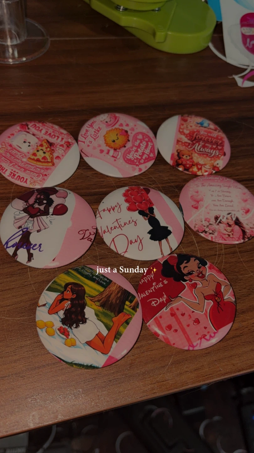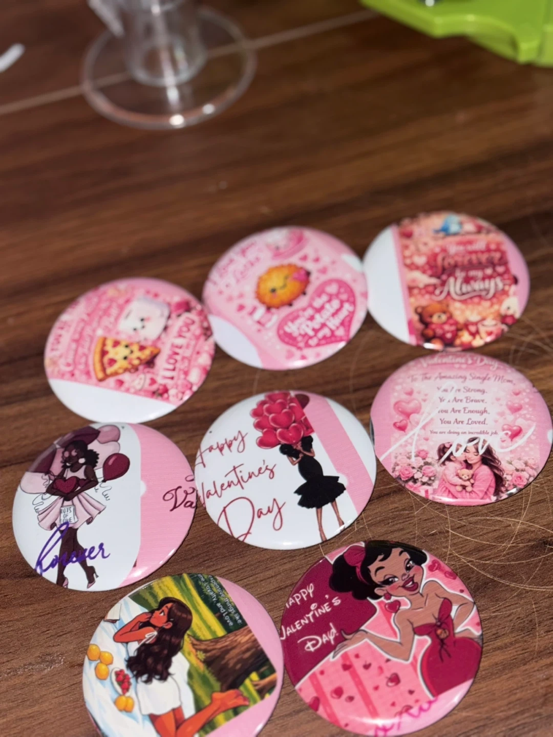 A collection of Valentine's Day themed button pins! They feature cute and fun designs, perfect for adding a touch of love to your outfit or accessories