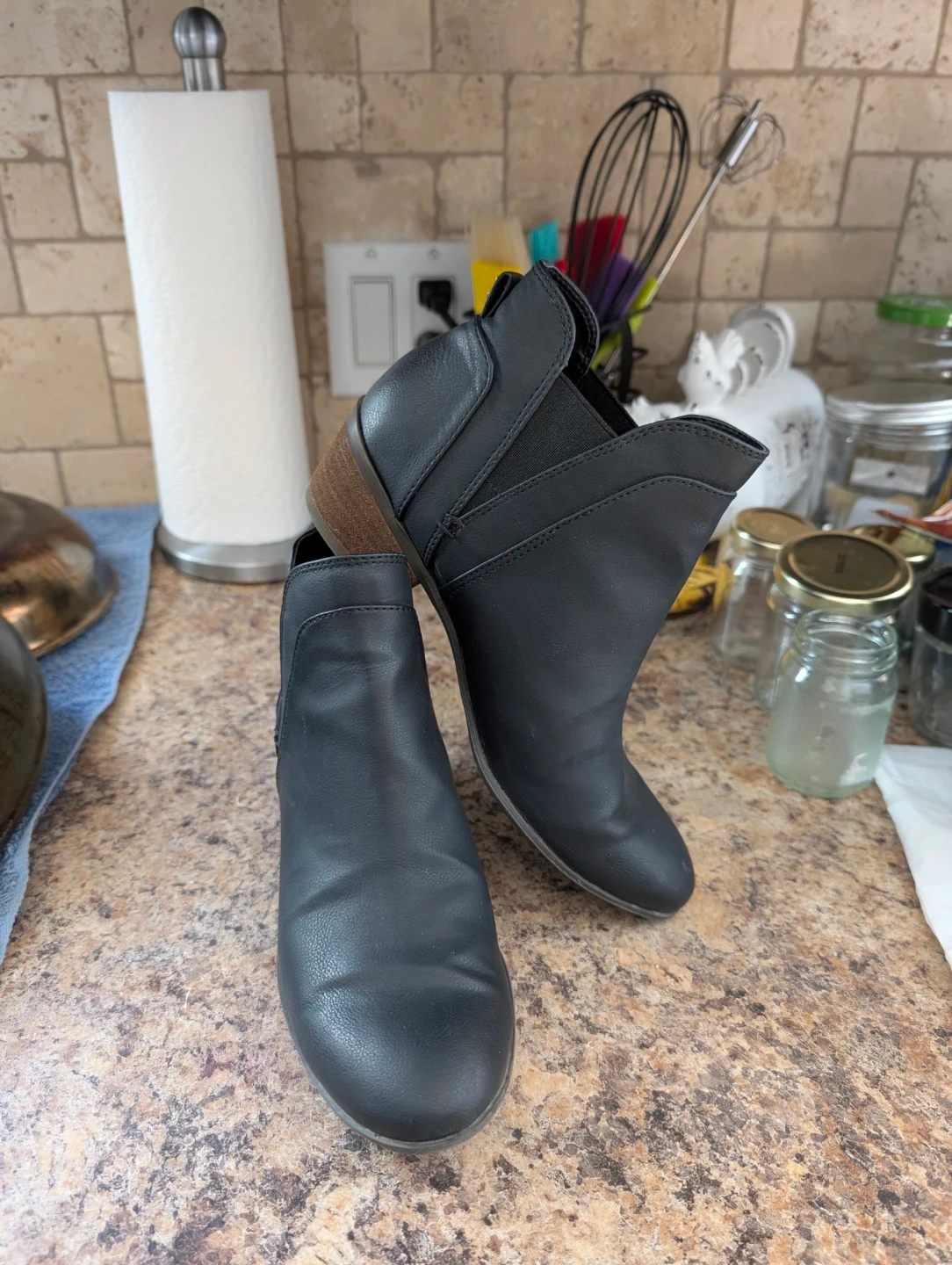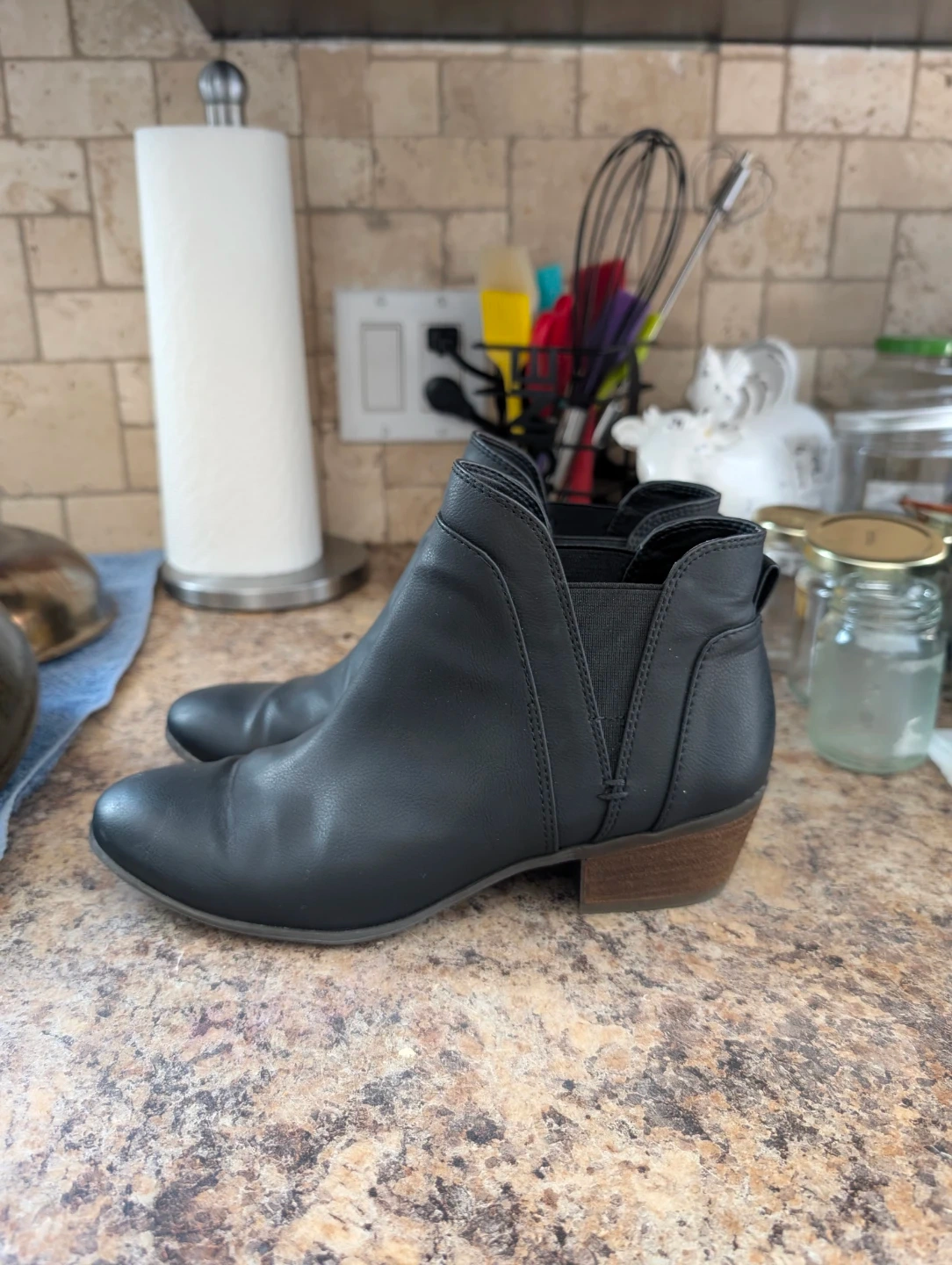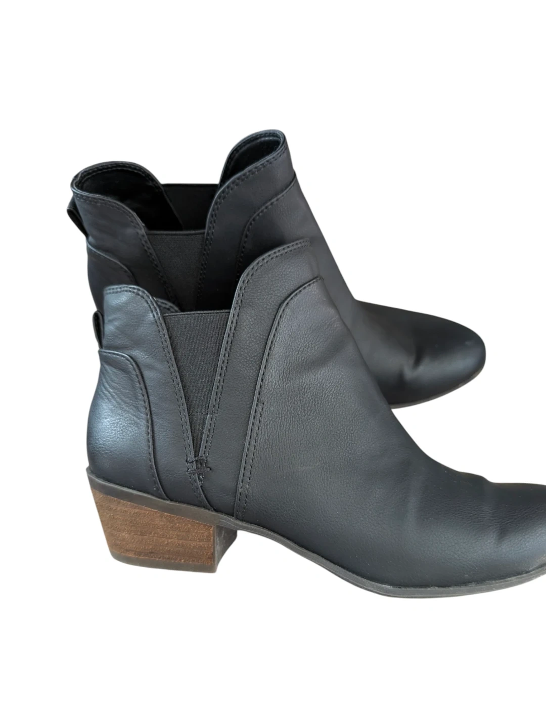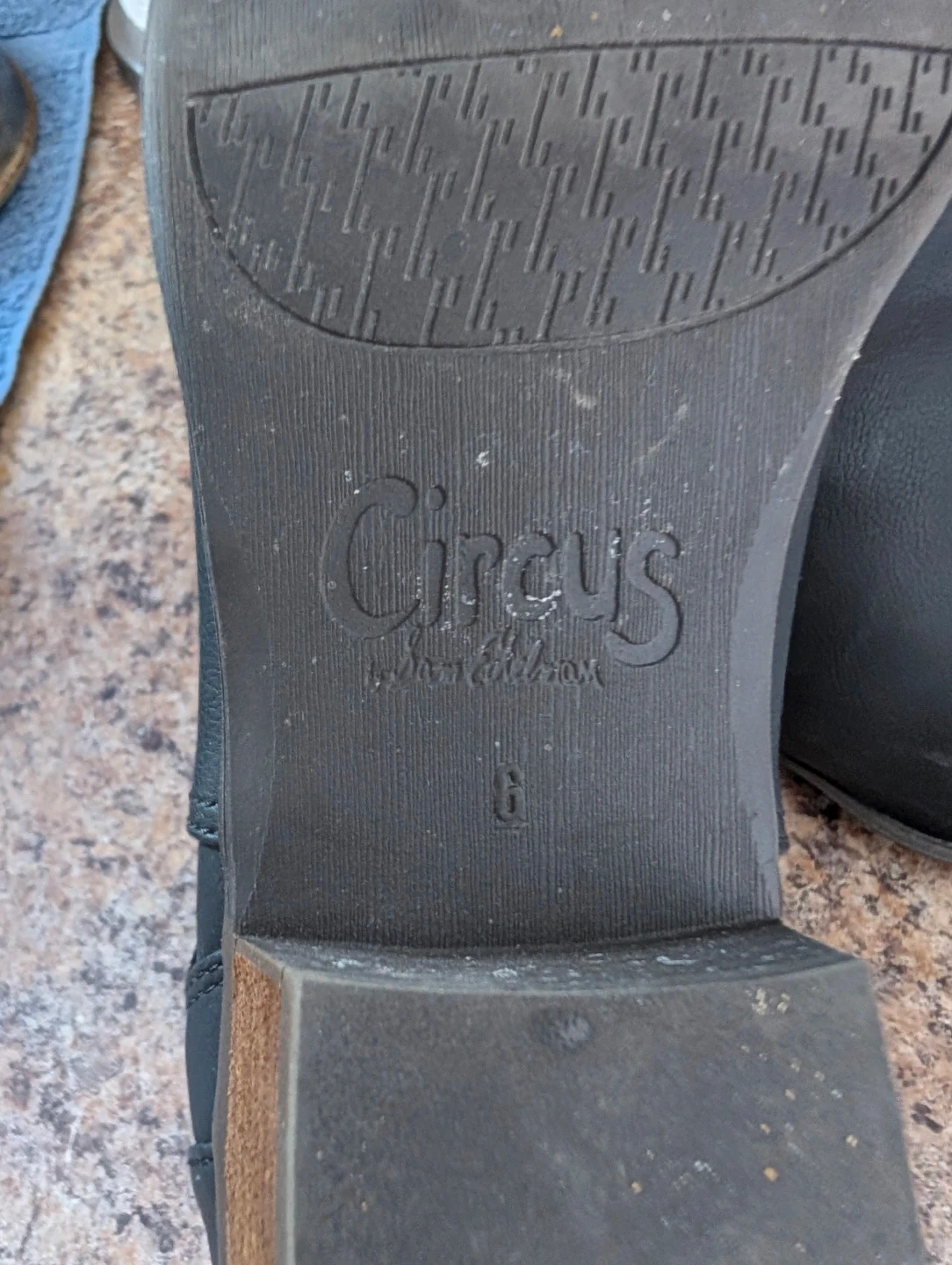 These black ankle boots from Circus by Sam Edelman are a stylish choice for any outfit. They feature a Chelsea boot design with elastic side panels. The faux leather material and wooden block heel offer a classic look. Size is 6.