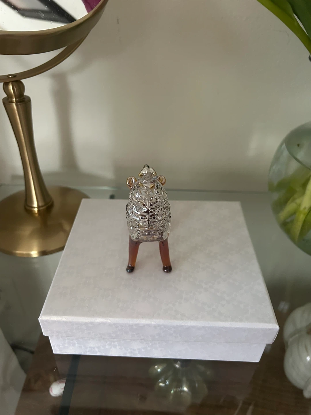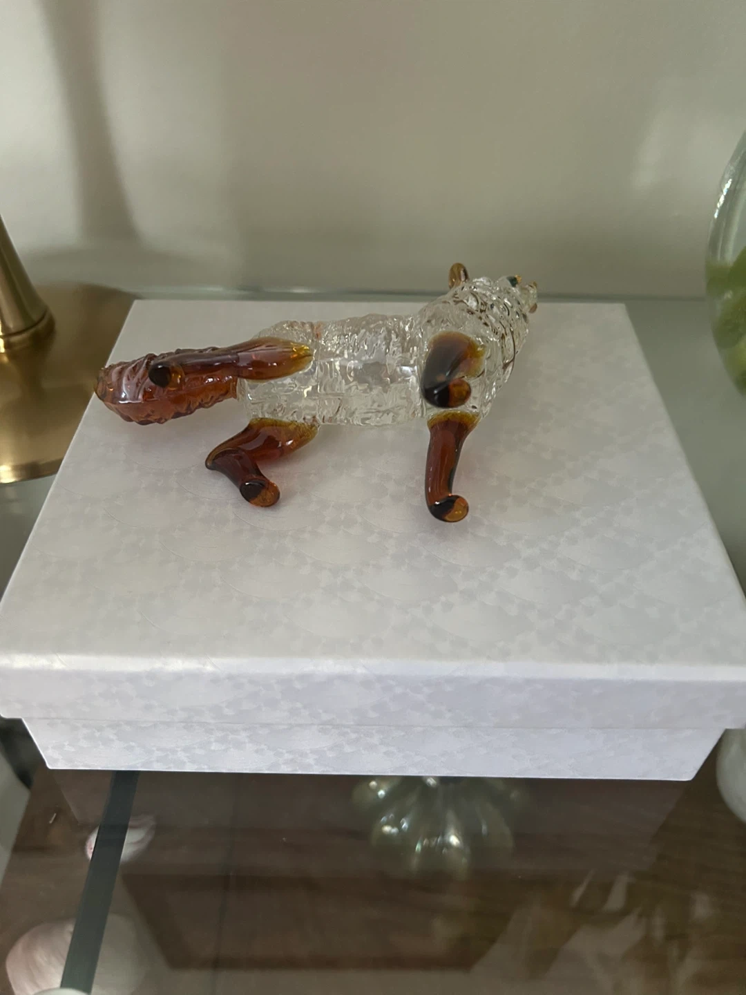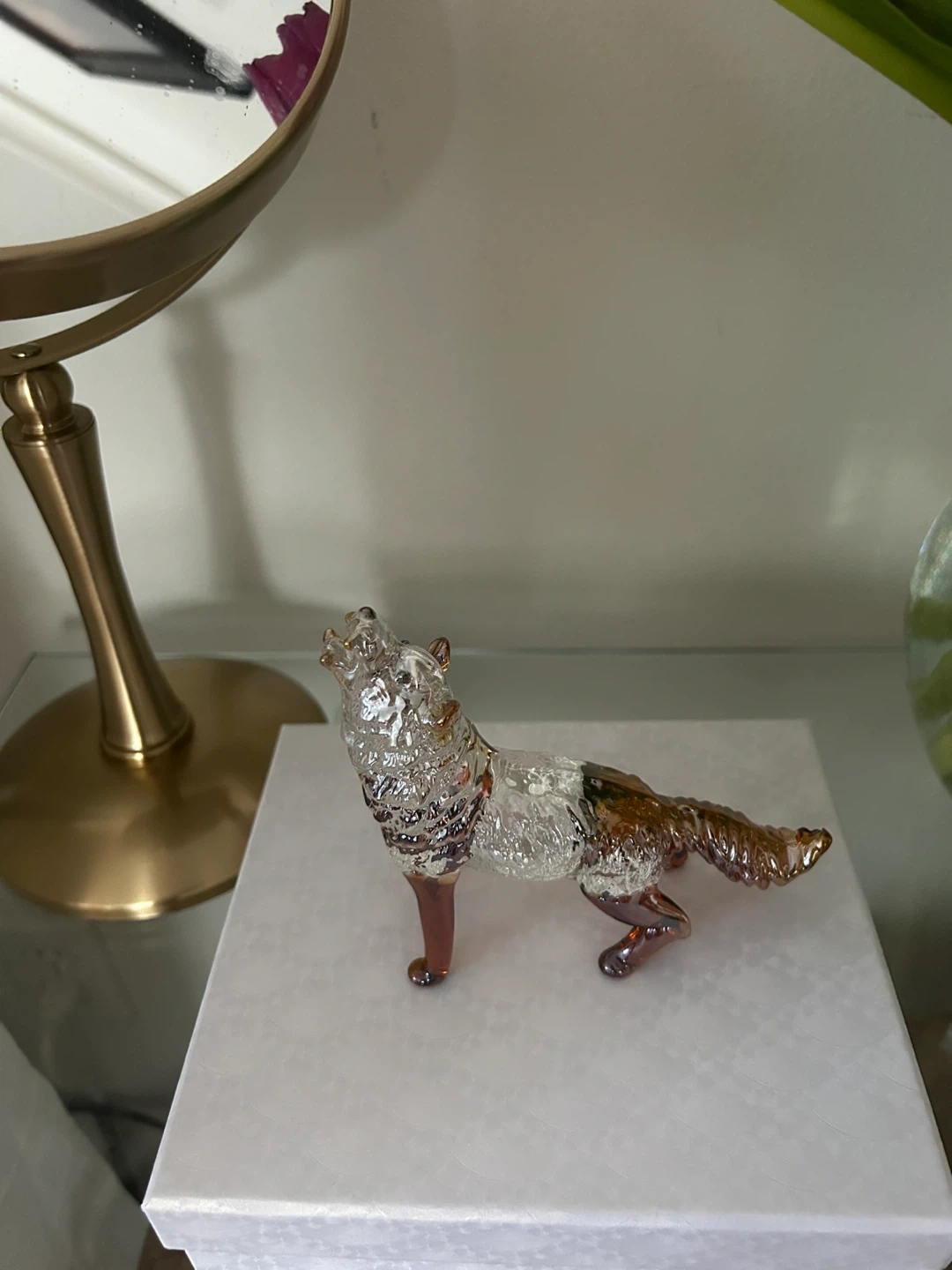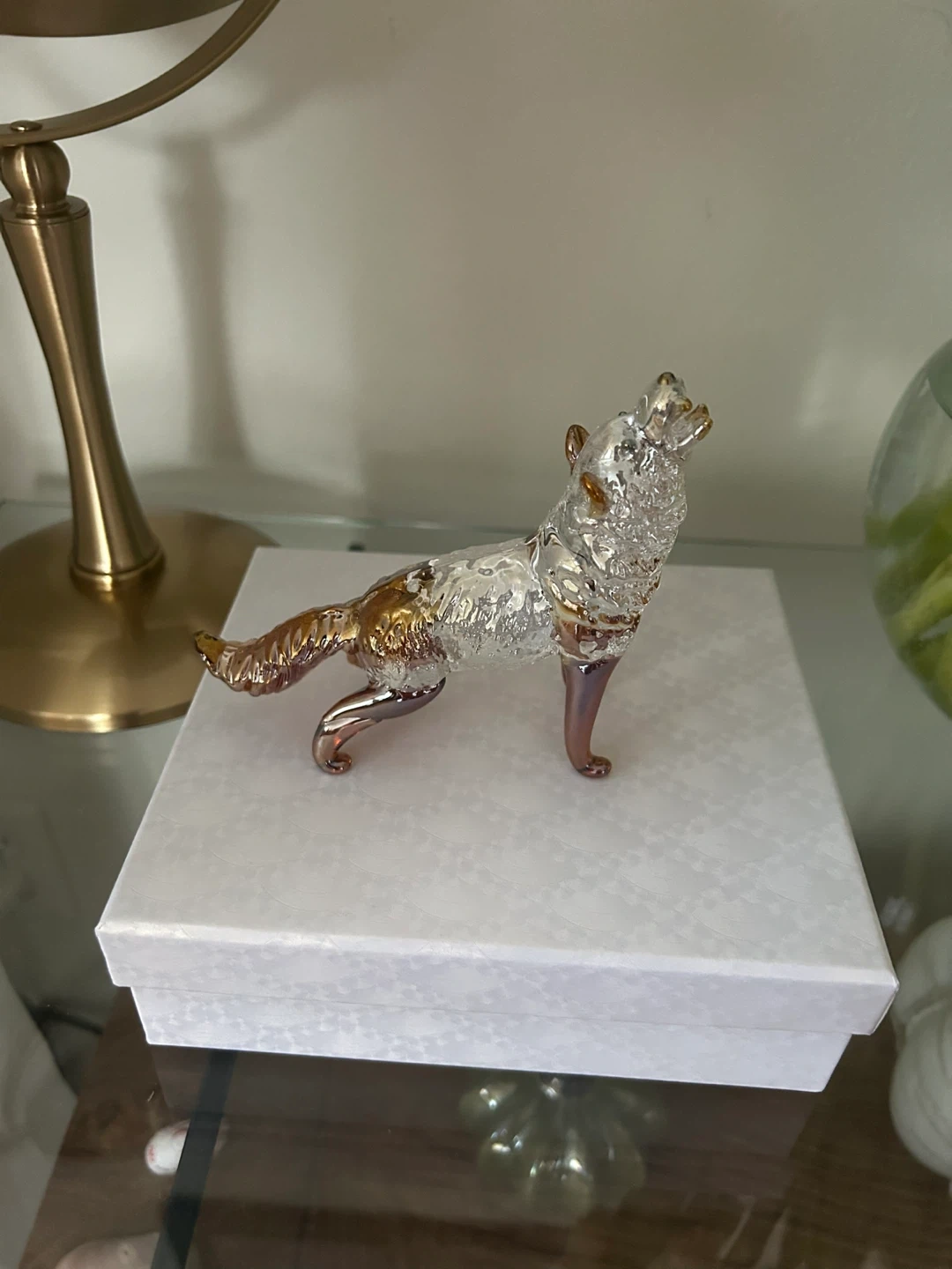 This is a decorative glass wolf figurine. It's clear with amber accents on its legs and tail. Comes in a presentation box with a cleaning cloth.