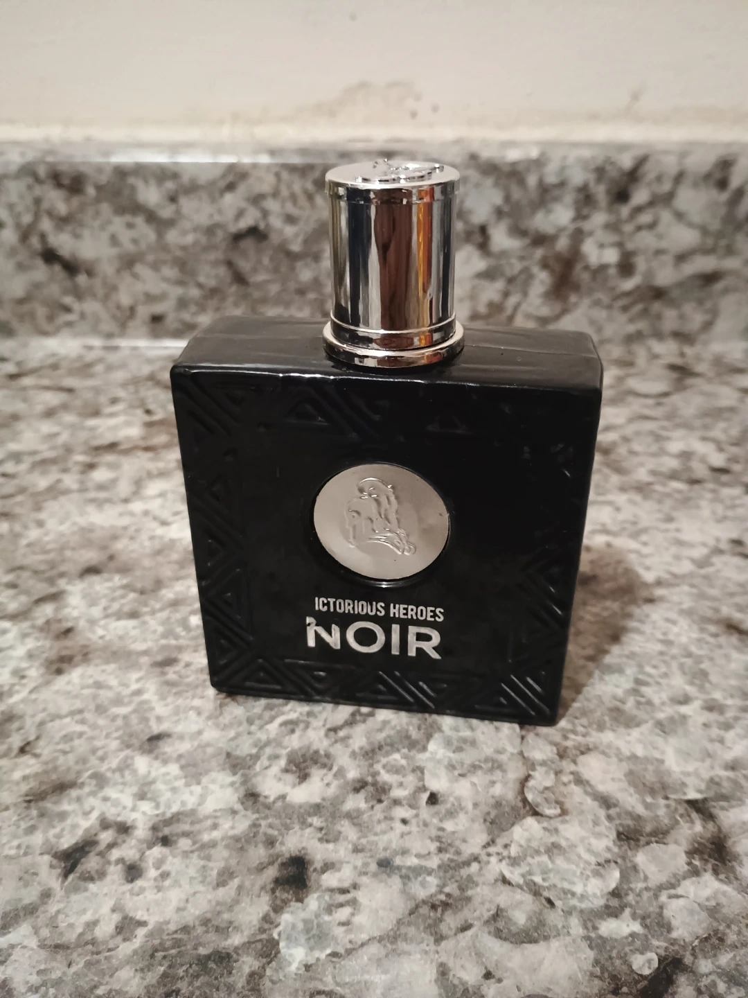 Victorious Heroes Noir fragrance for men. Black glass bottle with a silver cap. Black bottle with embossed pattern. This scent is perfect for evening wear.