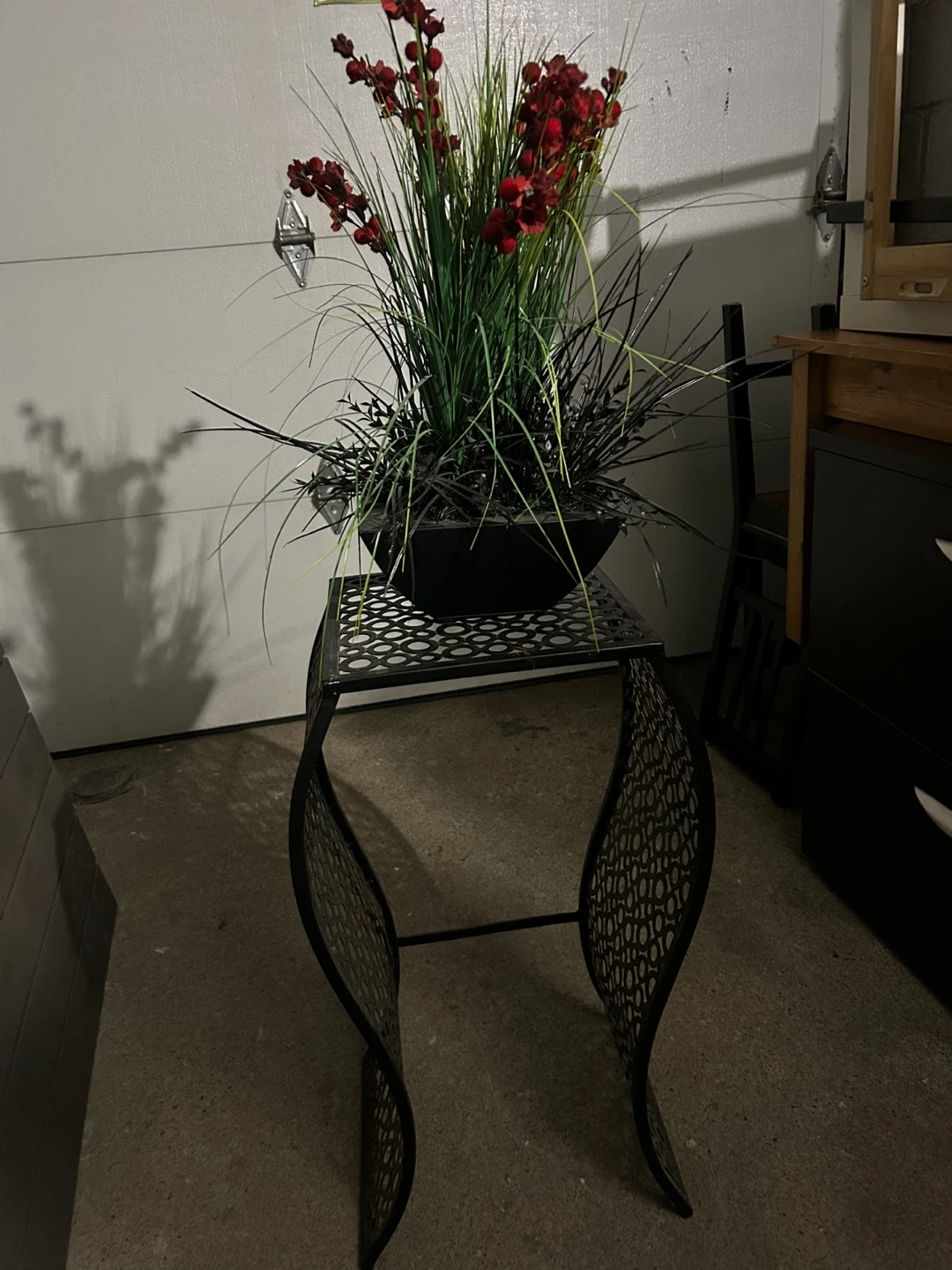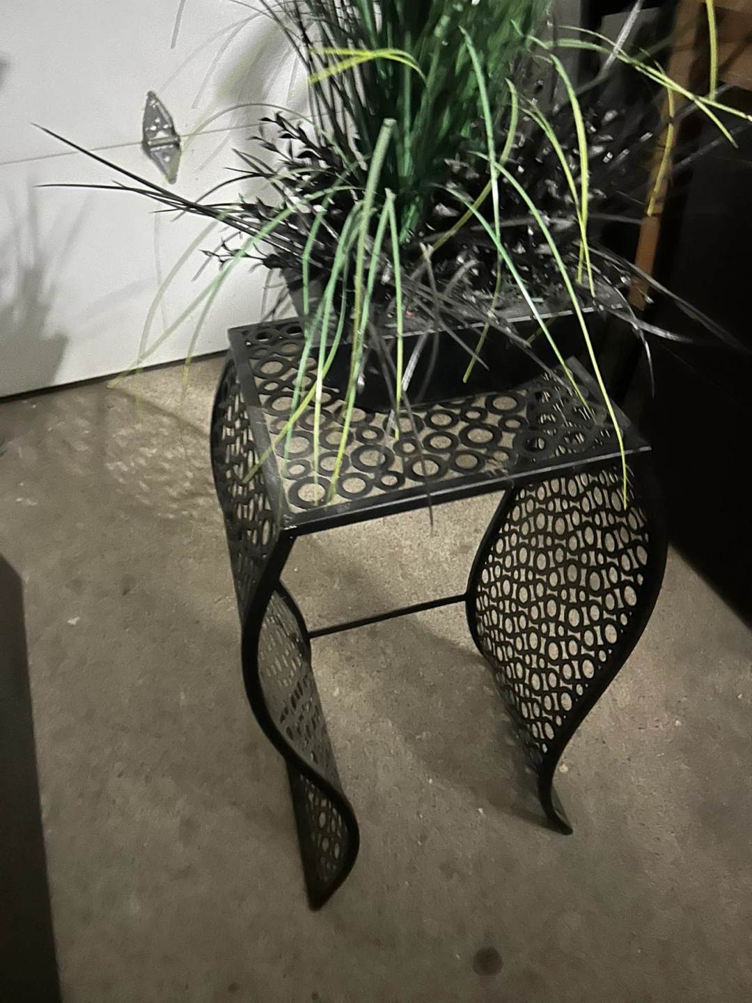 A black decorative metal plant stand featuring an intricate cutout circle pattern. This stand adds a stylish touch to any indoor or outdoor space. It's perfect for displaying potted plants or small decor items. The metal construction ensures durability.