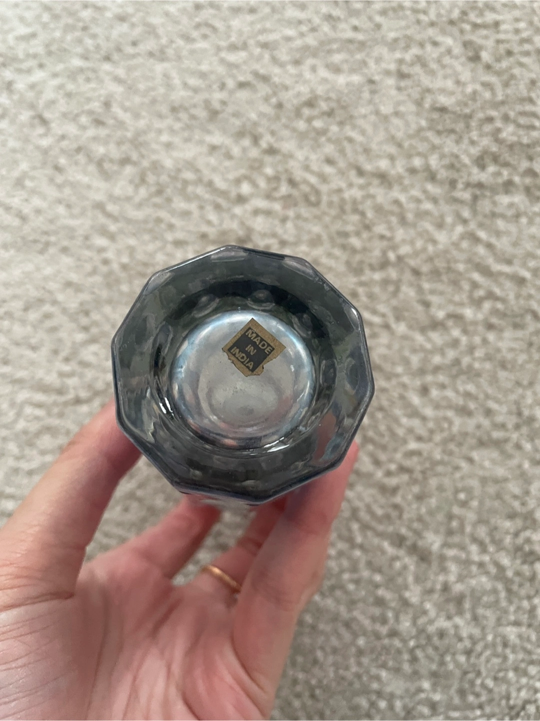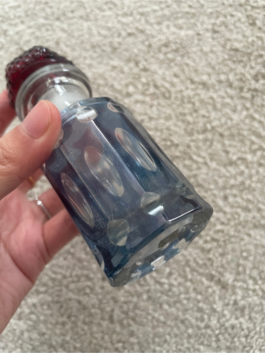 Beautiful glass perfume bottle with a decorative red stopper. It's made of blue-tinted glass with an octagonal base. This bottle was made in India. It's a lovely piece for displaying on a dresser or vanity.