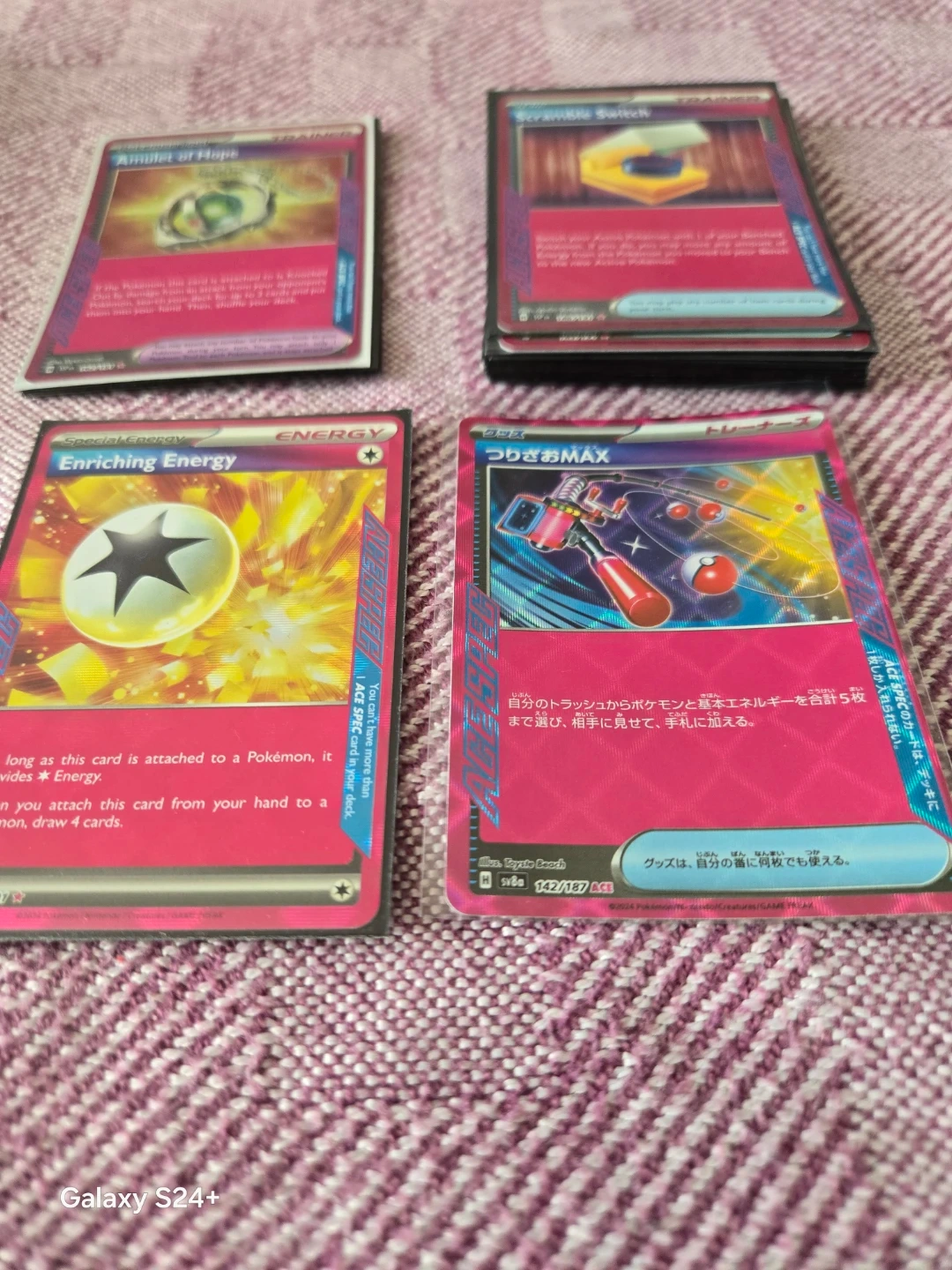 Includes Amulet of Hope, Scramble Switch, Enriching Energy, and Tsuyosabo MAX trainer cards. These are for the Pokemon Trading Card Game. Great for collectors or players!