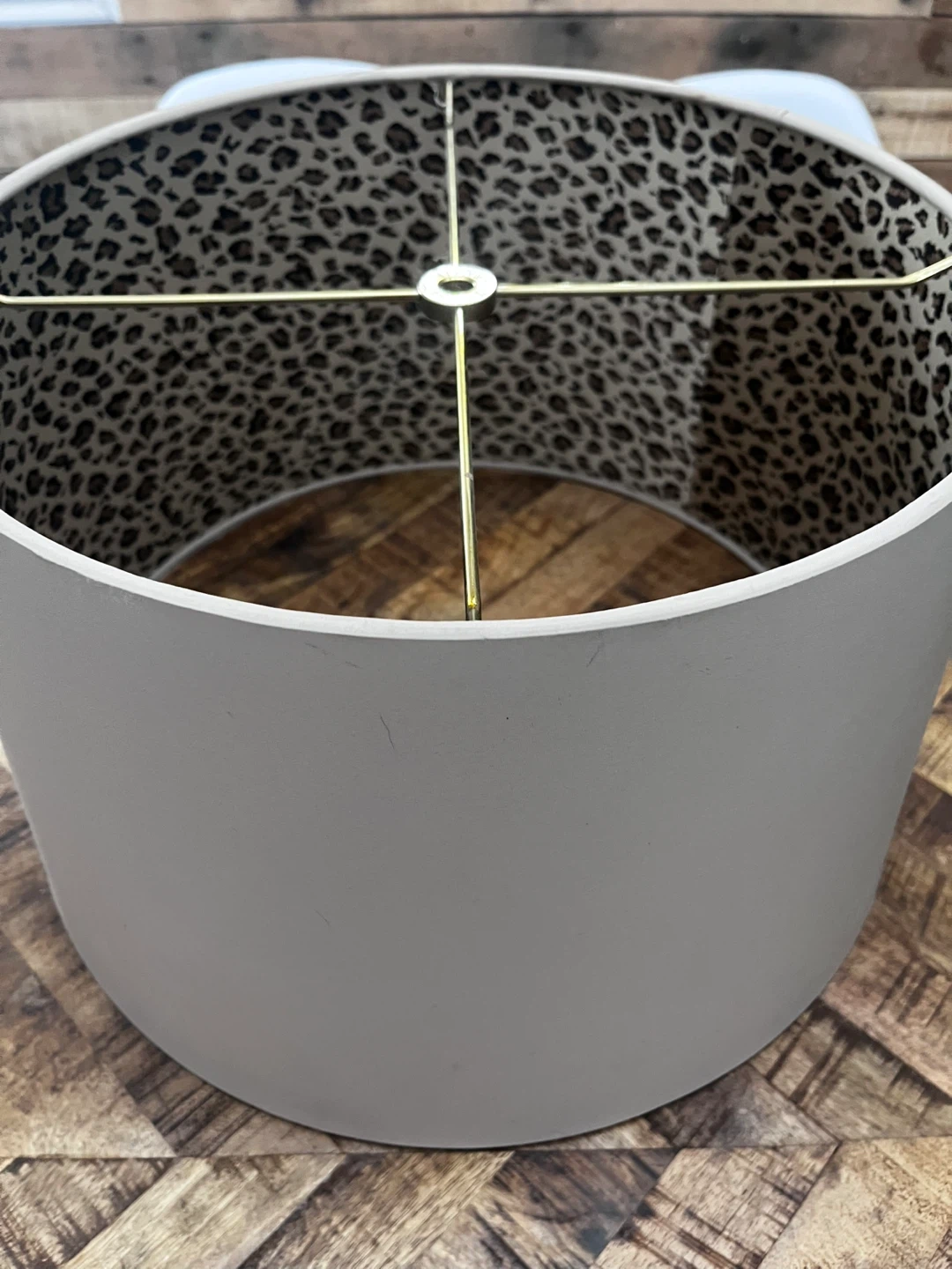 🥕This is a lampshade with a neutral exterior colour. The interior lining features a bold leopard print design. It's a great way to add a touch of pattern to your lighting. It has a standard fitting for a lampshade.
