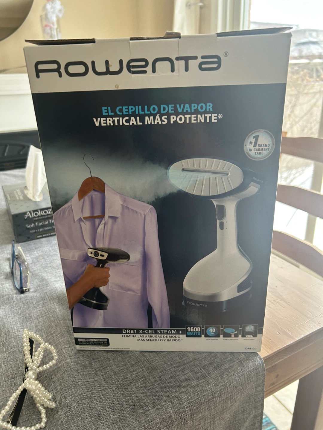 Rowenta DR81 X-CEL Steam+ garment steamer. It's a powerful vertical garment steamer designed to quickly remove wrinkles. It heats up in just 40 seconds and has 1600 watts of power.