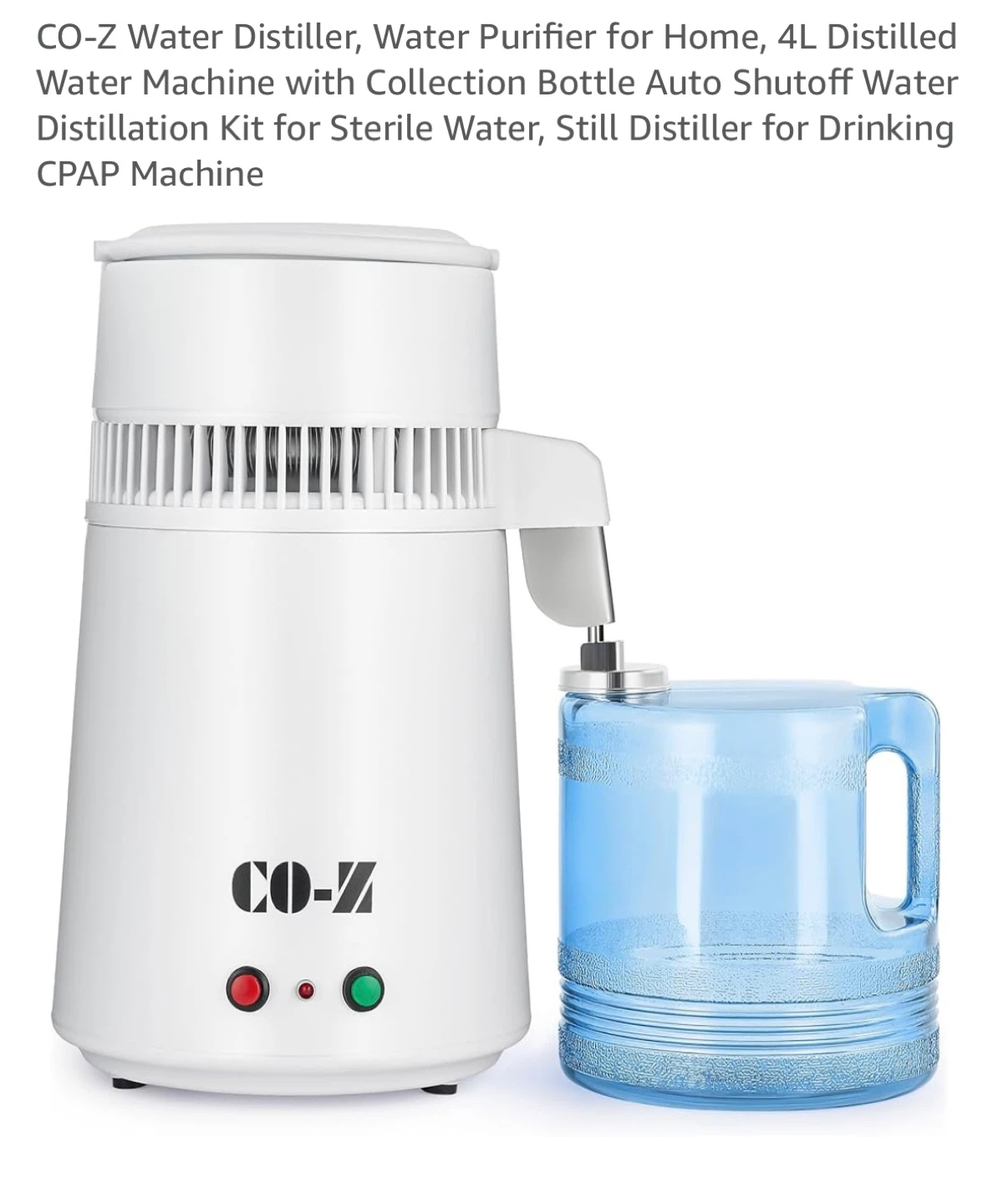 I'm selling a CO-Z water distiller and purifier for home use. It's a 4L distilled water machine that comes with a collection bottle and auto shutoff feature. It's perfect for sterile water and can be used as a still distiller for drinking water or for CPAP machines