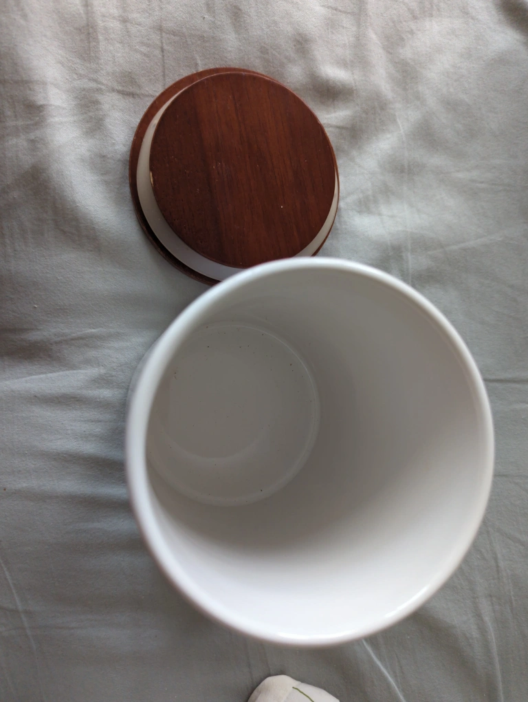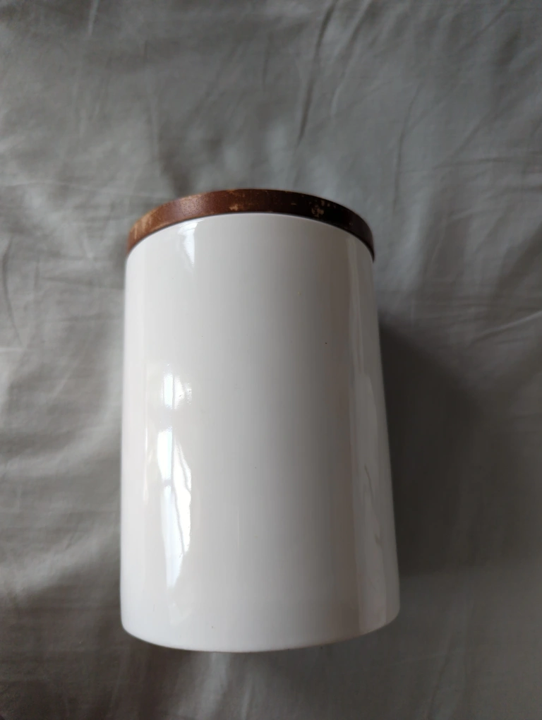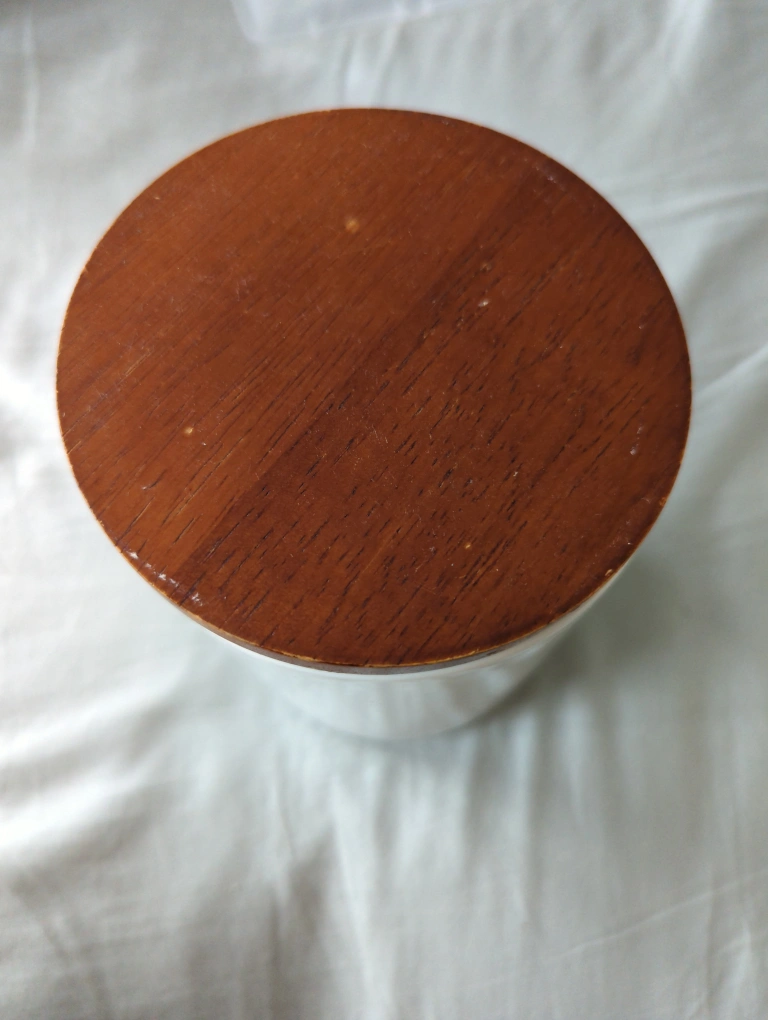 White ceramic storage jar with a wooden lid. It is approximately 6 inches tall. It would be great for storing tea, coffee, sugar, flour, or other dry goods. The jar is in good condition, but has some marks on the lid.