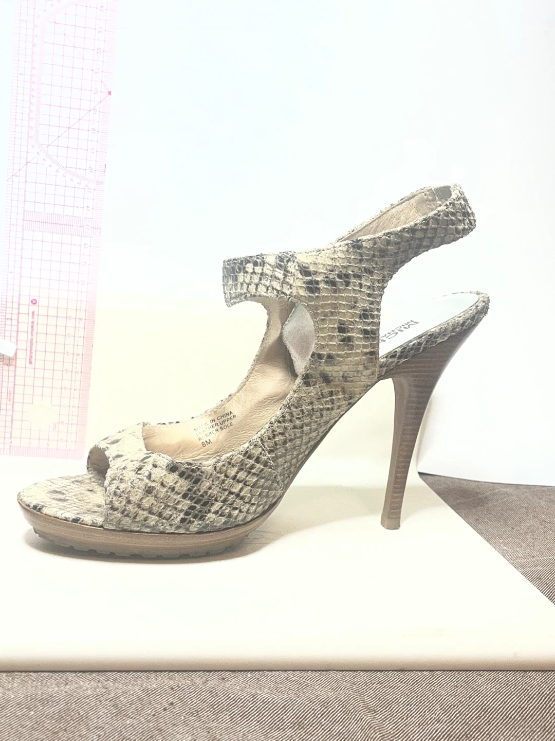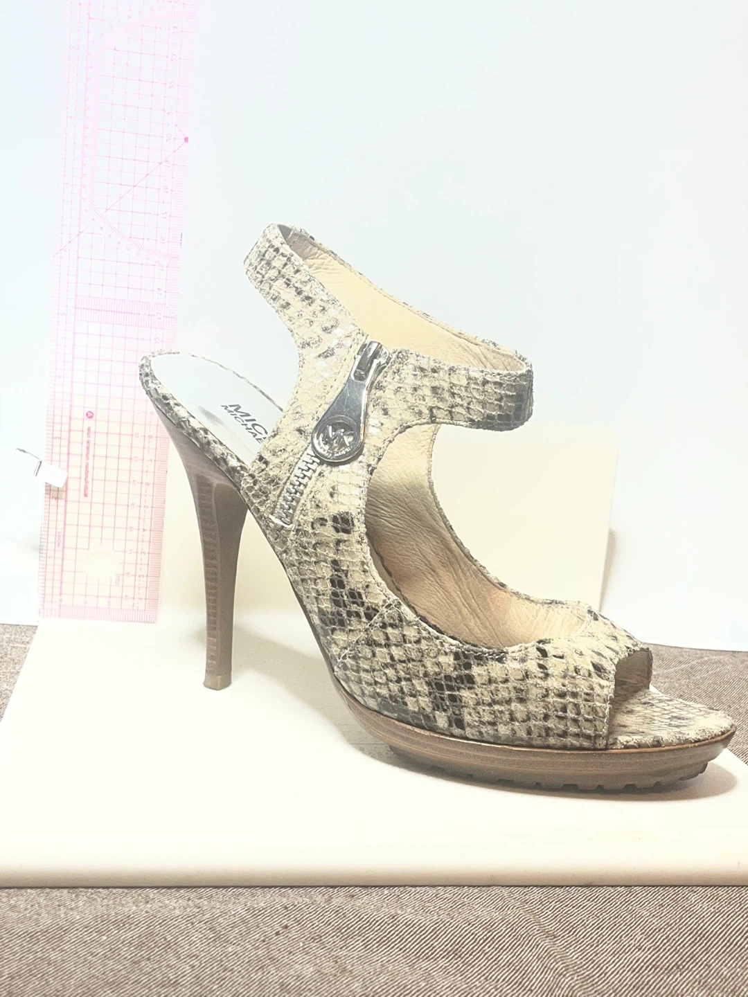These Michael Kors heels feature a cool snake print and a stylish zip detail. They're a size 8M. 11 cm or 4” hills.The wooden heel adds a nice touch!