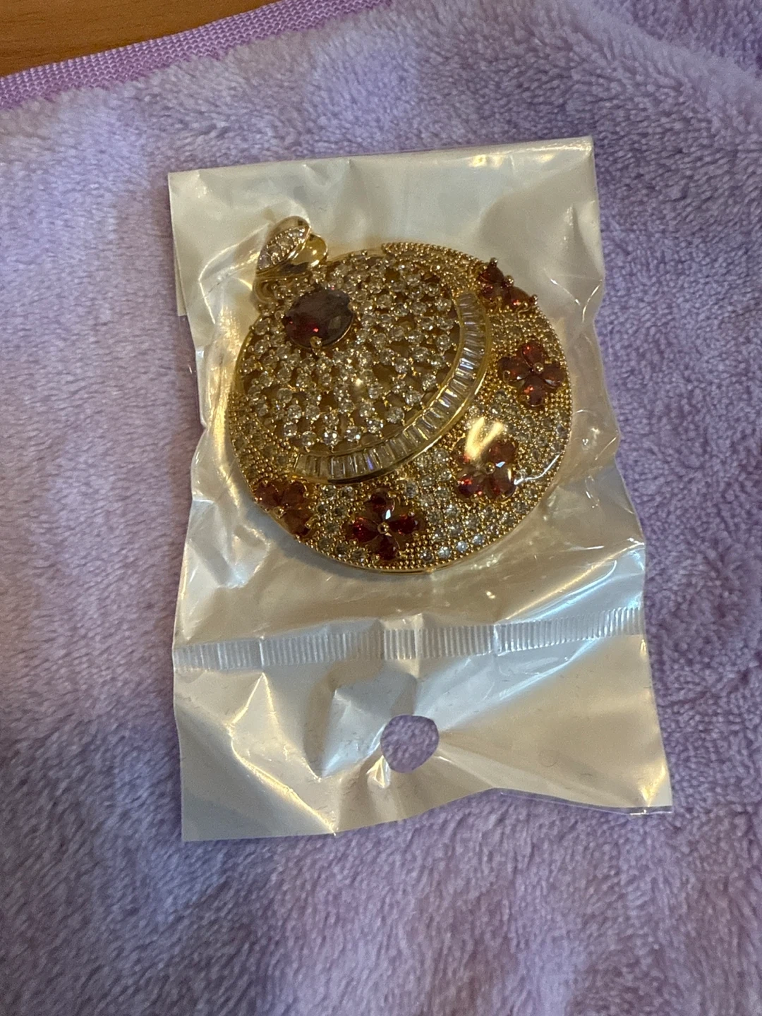 This is a striking gold-tone pendant, intricately designed with numerous clear stones and several red accent stones. The piece is circular with a decorative, layered pattern. It's still in its original protective packaging. This pendant would add a touch of sparkle to any outfit.