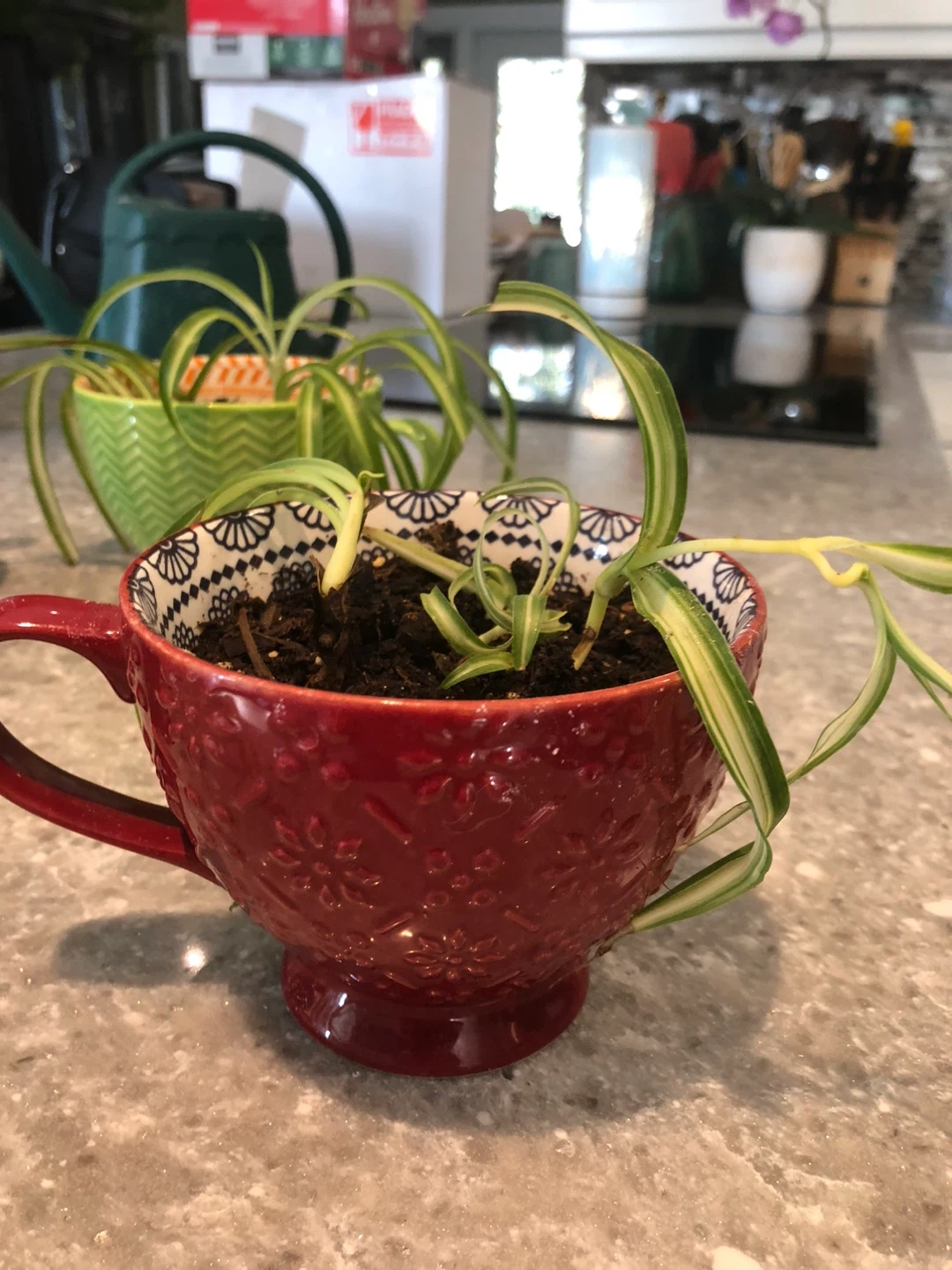 I'm selling some lovely spider plants potted in decorative mugs. They're all healthy and ready to brighten up your space! Each plant comes in its own unique mug, adding a touch of charm to any room. They're super easy to care for and great for adding a bit of greenery to your home.
