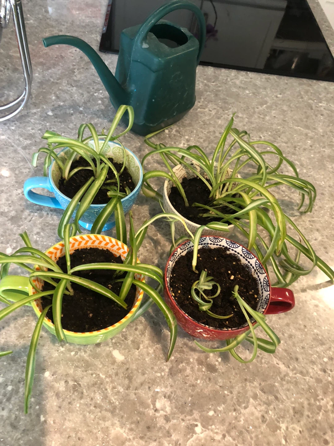 I'm selling some lovely spider plants potted in decorative mugs. They're all healthy and ready to brighten up your space! Each plant comes in its own unique mug, adding a touch of charm to any room. They're super easy to care for and great for adding a bit of greenery to your home.