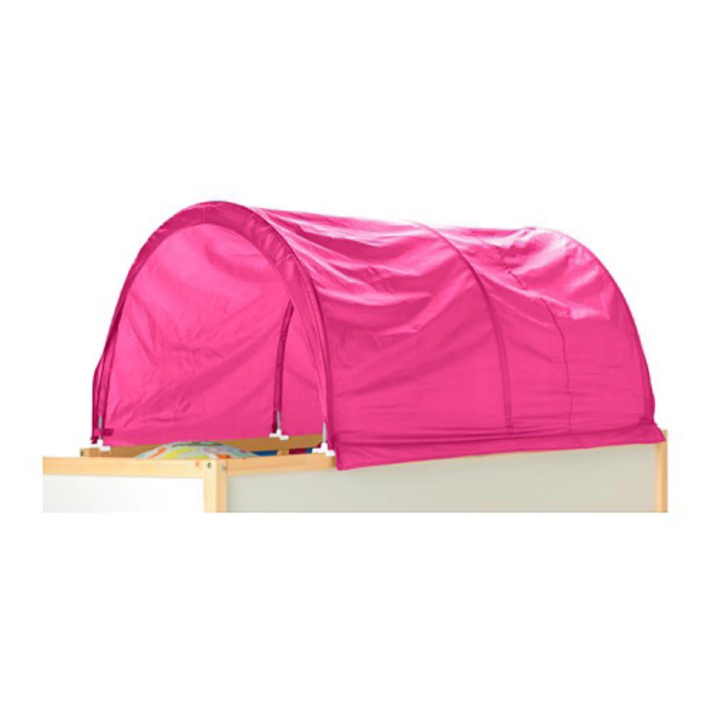 These bed tents create a fun, enclosed space for kids. It's made of fabric and fits securely onto a kura bed. Available in green or bright pink!