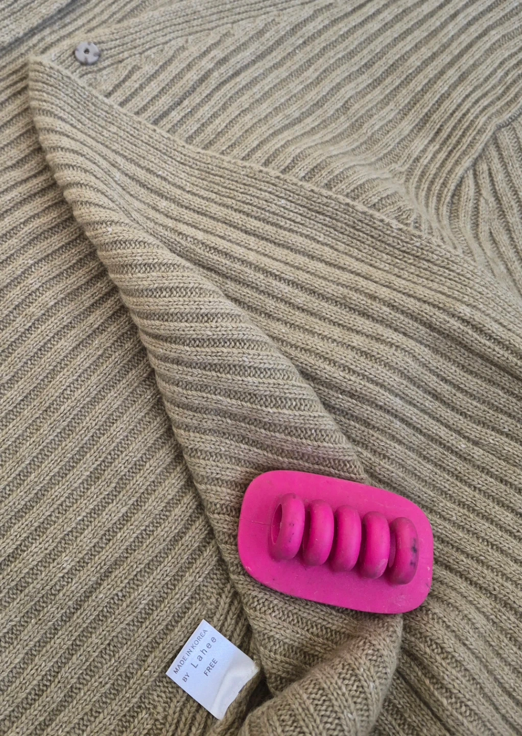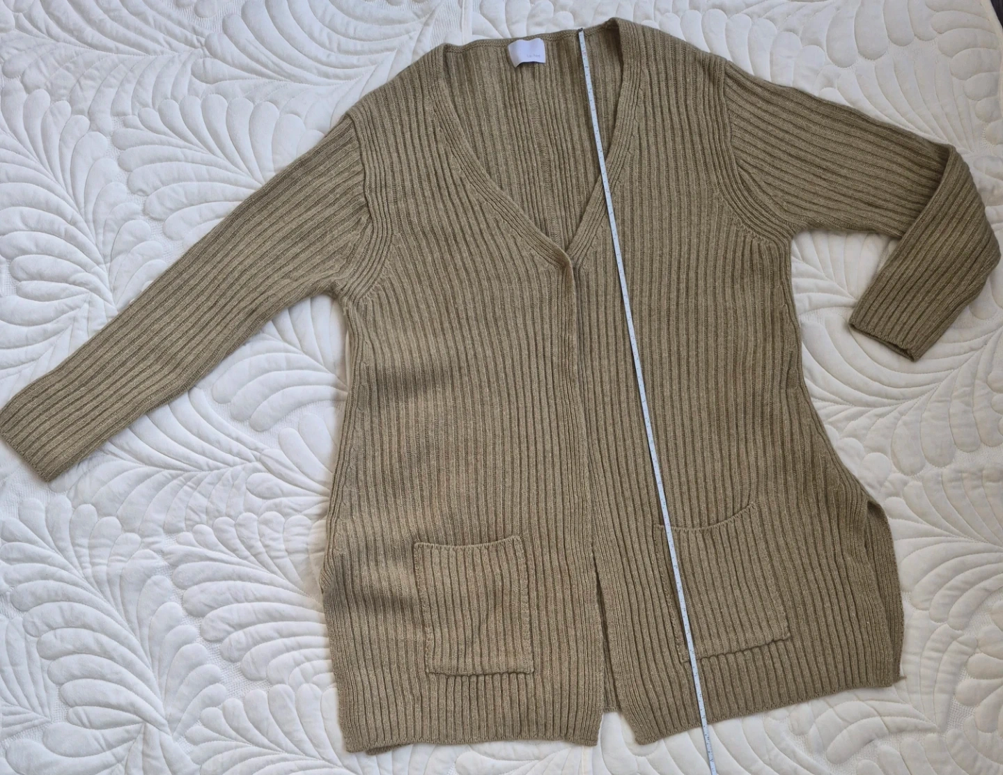 This is a BY LANEE "FREE" cardigan sweater in a ribbed knit. It features two front pockets and a button closure. Made in Korea.
