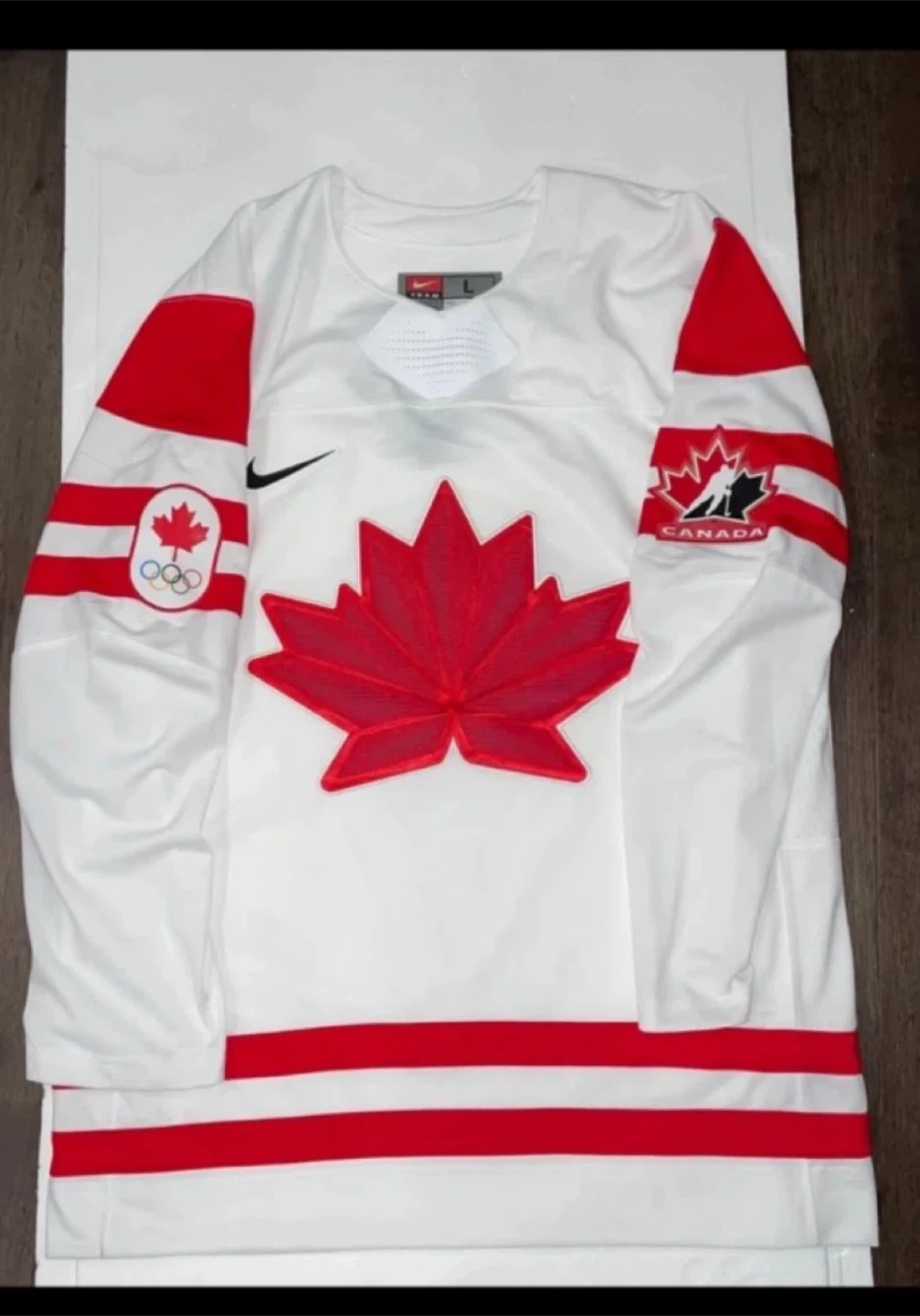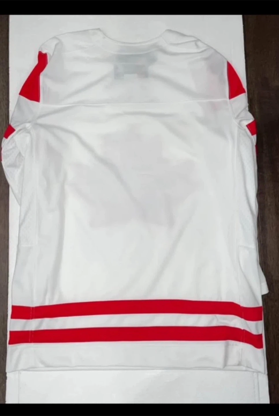 This is a Nike Team Canada hockey jersey. It's white with red accents and features a large maple leaf crest. Made in Vietnam.