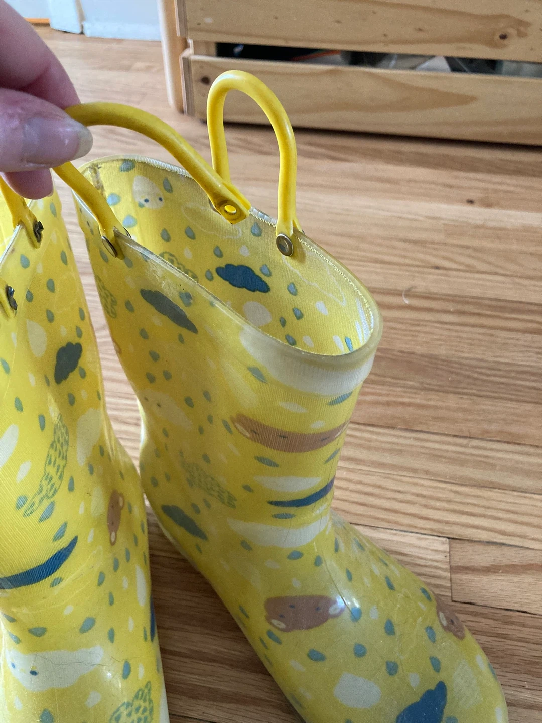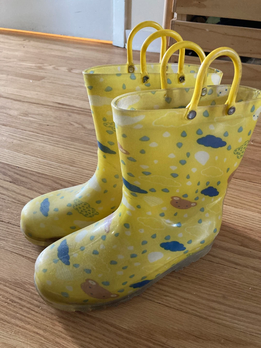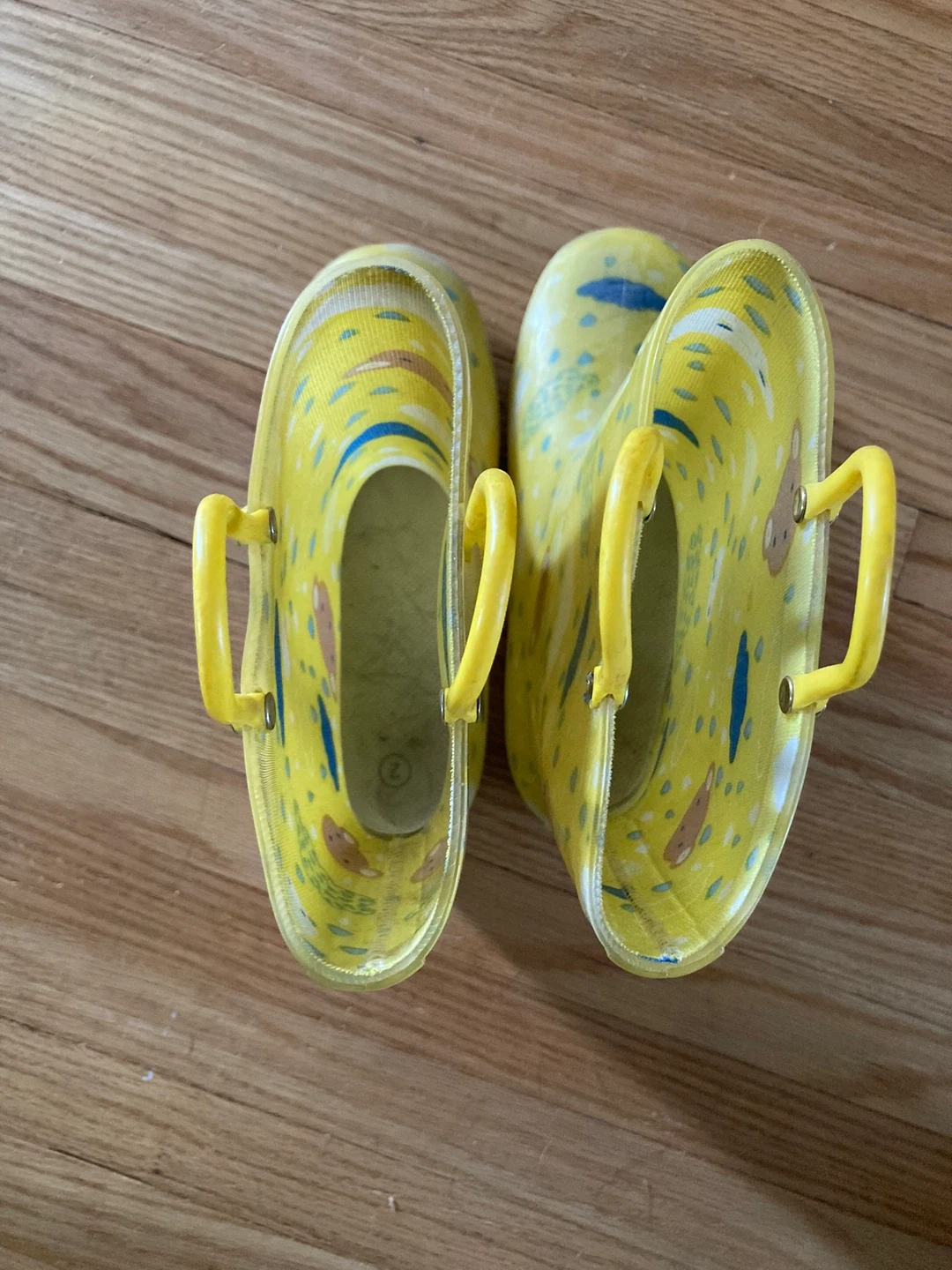 Yellow rain boots with fun light up heel! The light is orange in colour. I can send a video just I can’t post one here unfortunately.