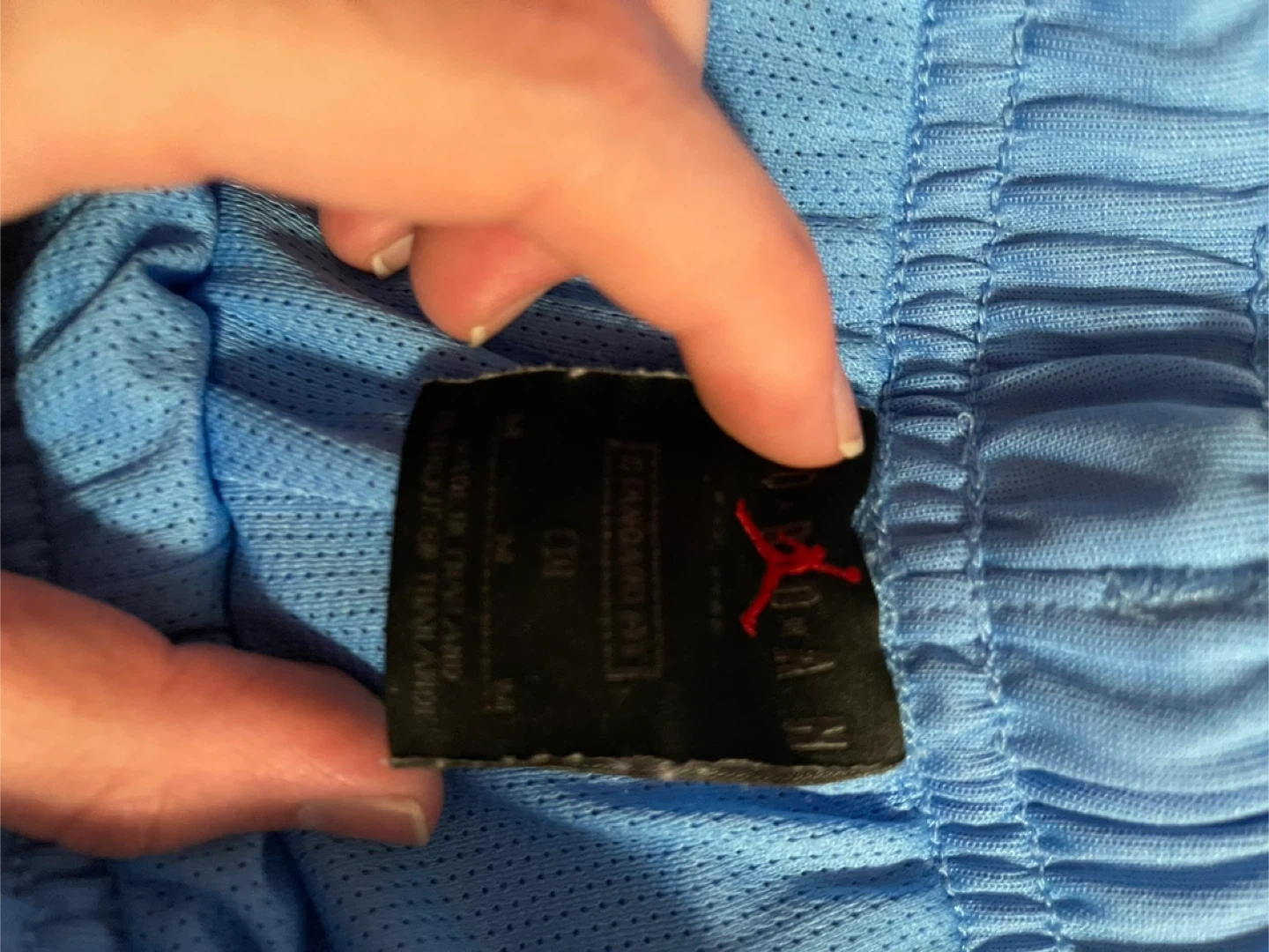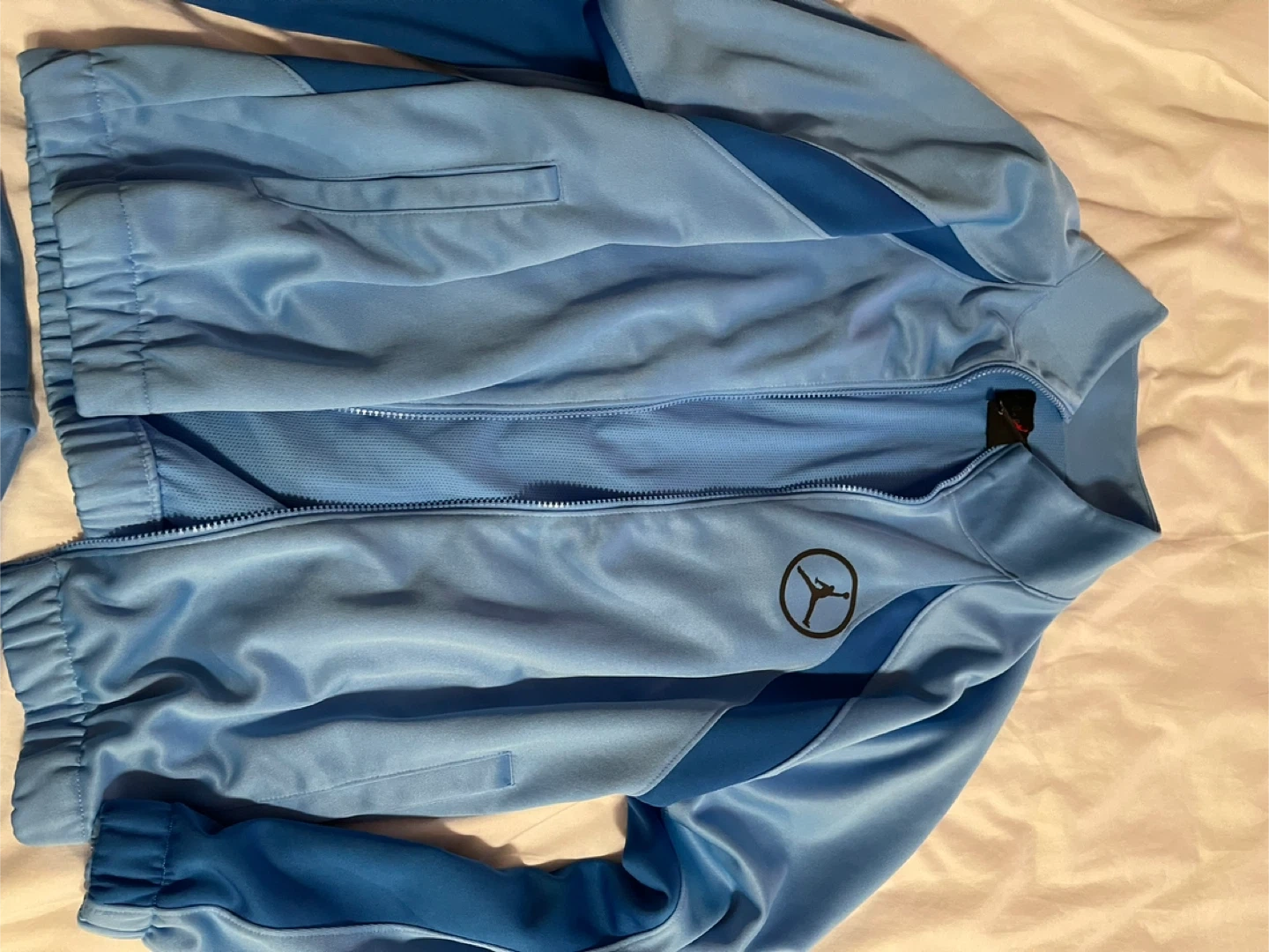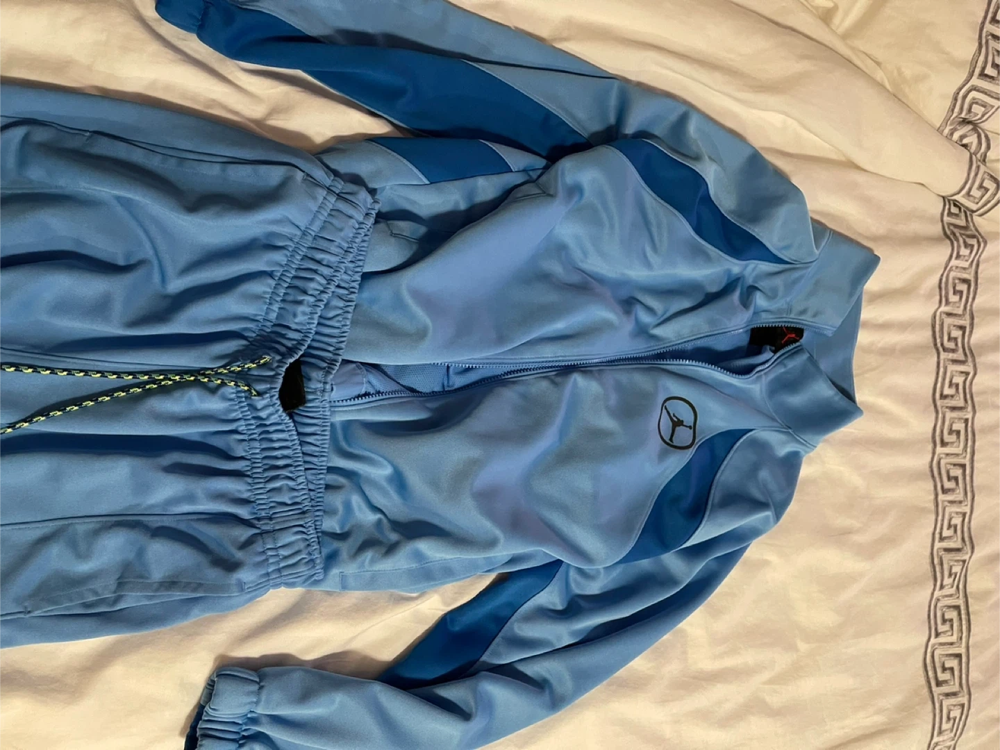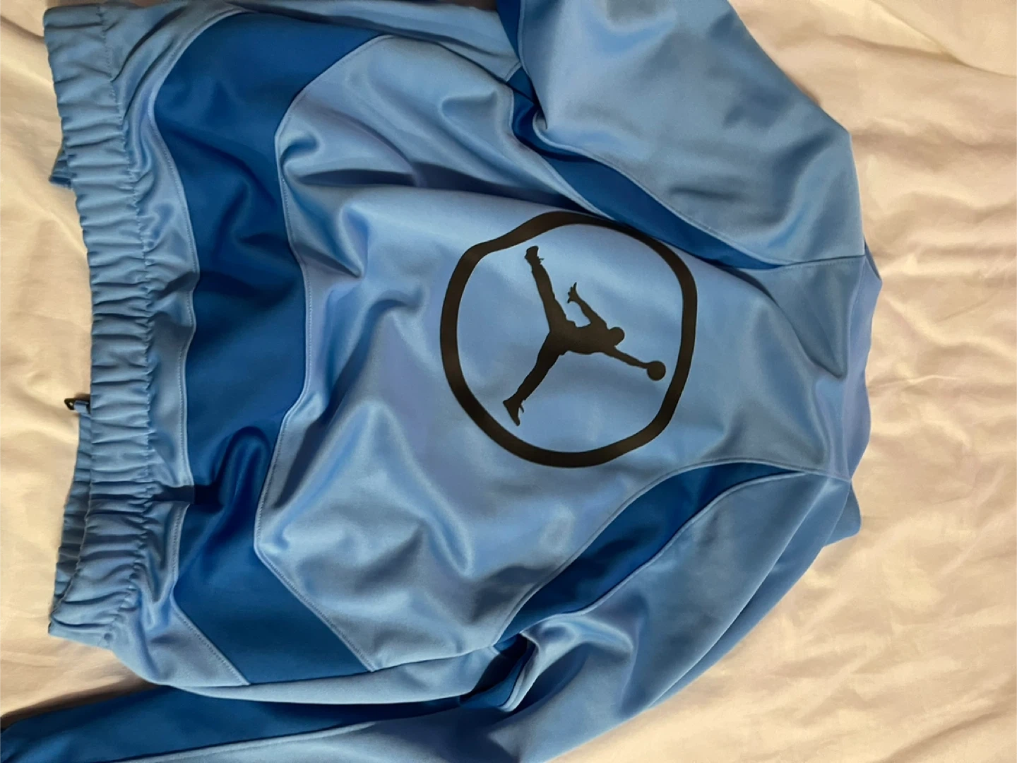 This is a Jordan tracksuit set in a bright blue colour. It's made of a smooth polyester material. The set includes a zip-up jacket and matching pants. It's a size medium.