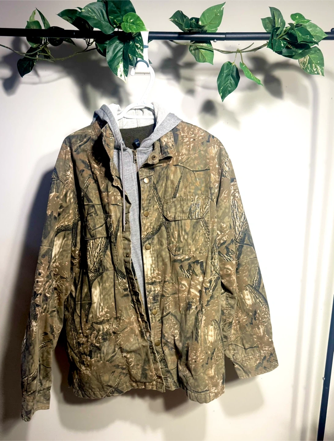 This men's jacket features a camouflage pattern with a grey attached hood. It's made from a durable canvas material with button closures. Plenty of pockets for storage!
