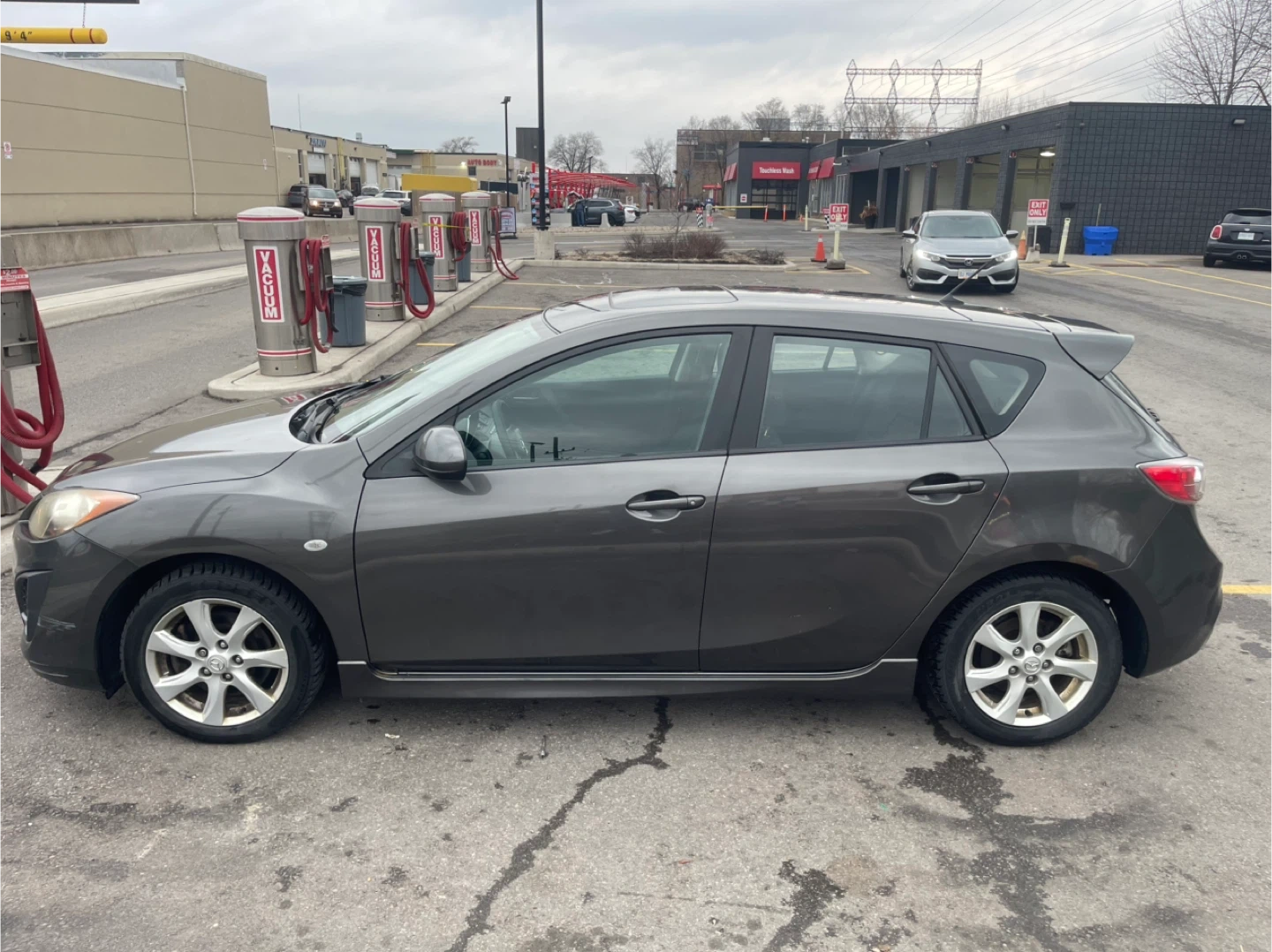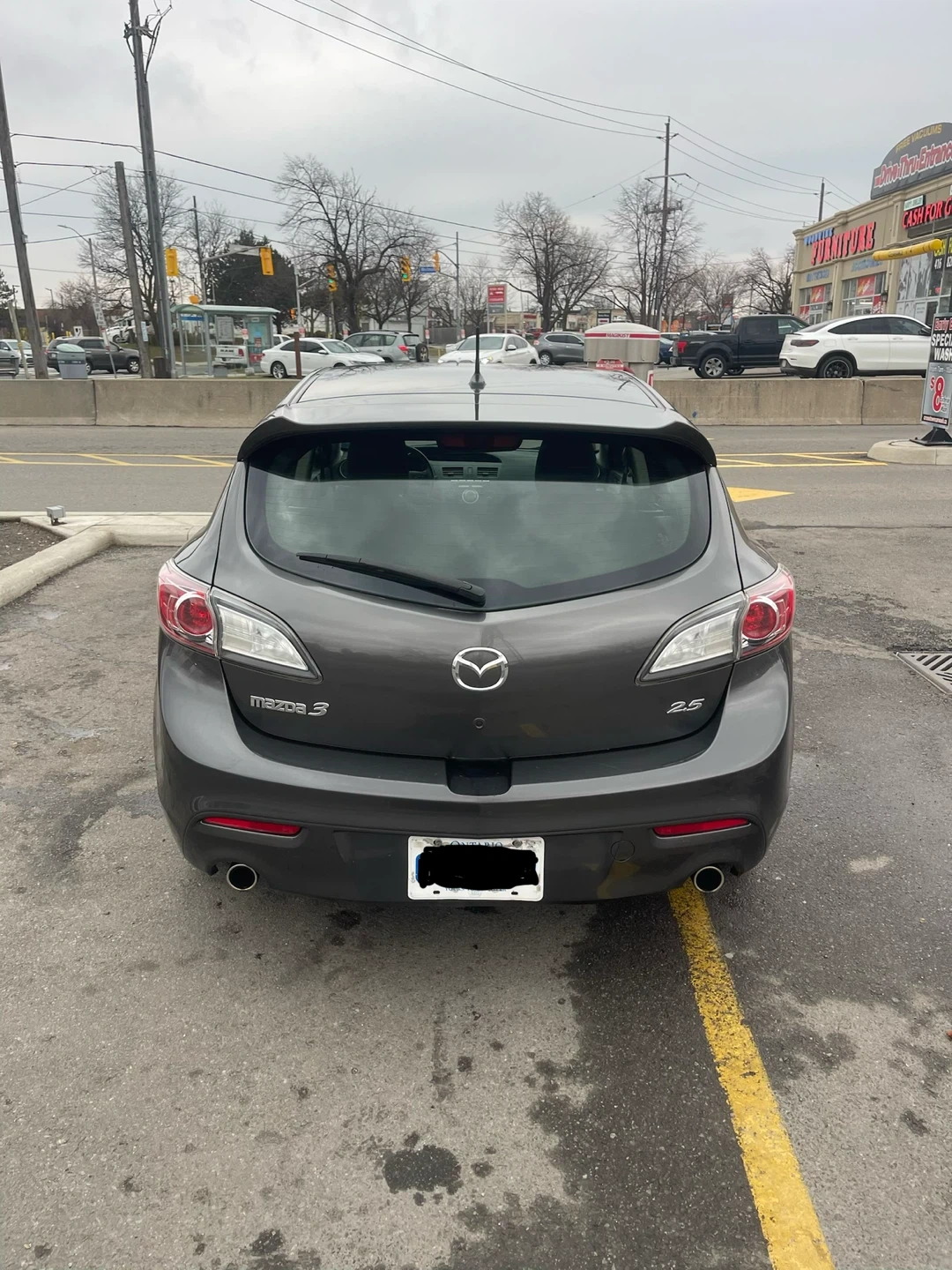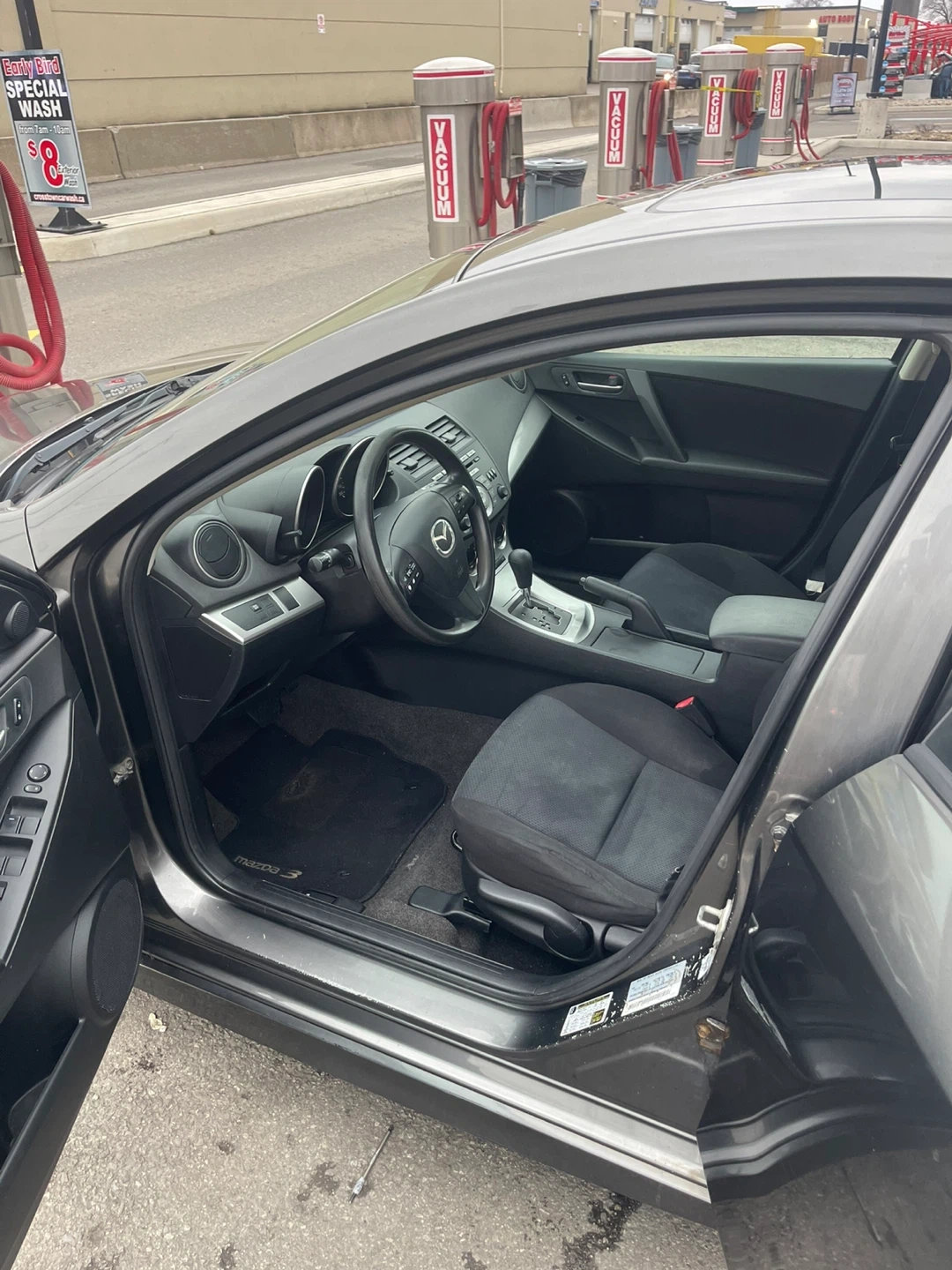 Grey 2010 Mazda 3 with a 2.5L engine. It's a five-door hatchback with a sporty design. Comfortable interior seating for passengers.