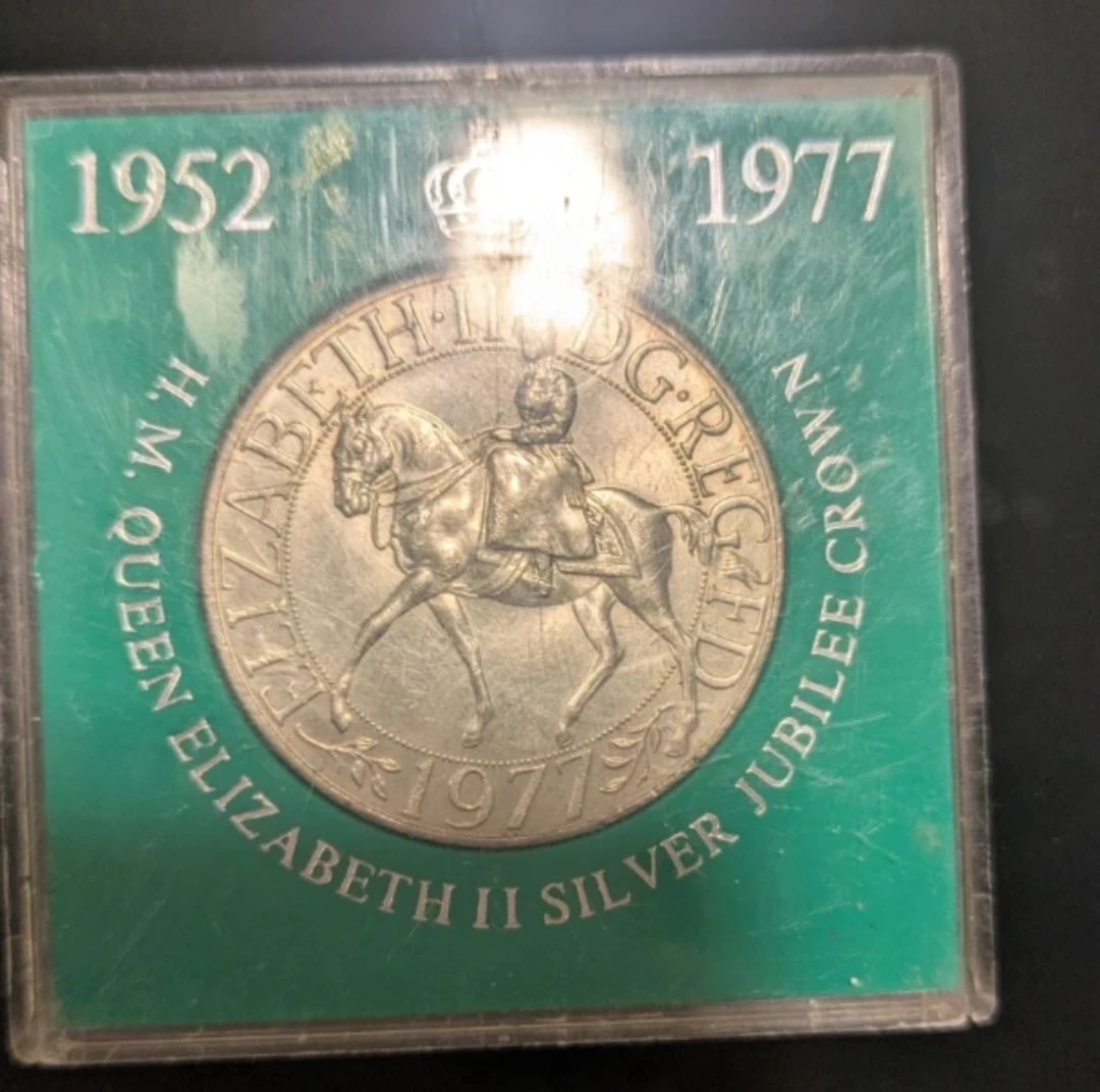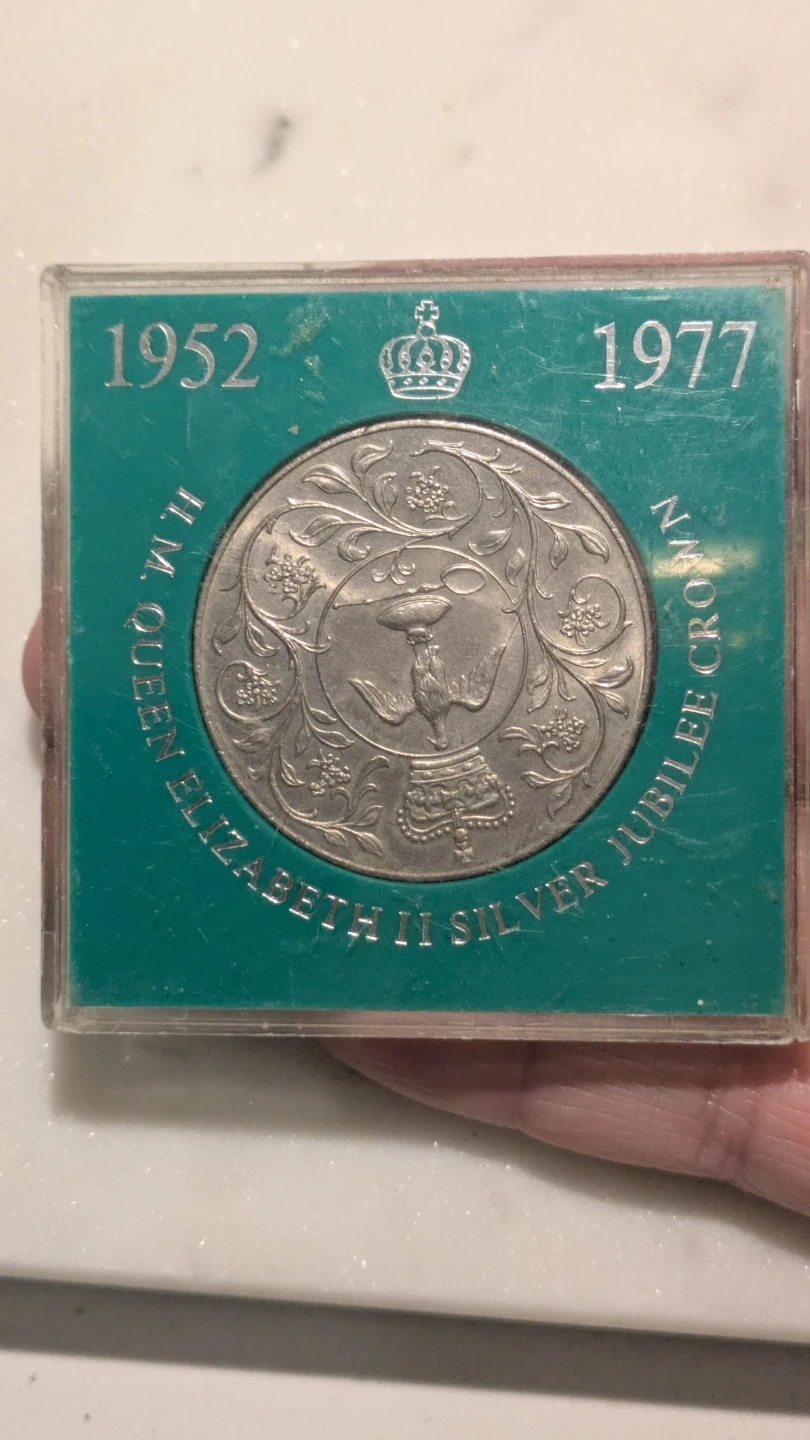 Commemorative silver crown coin celebrating Queen Elizabeth II's Silver Jubilee from 1952 to 1977. Features intricate designs on both sides of the coin. Comes in a protective case.