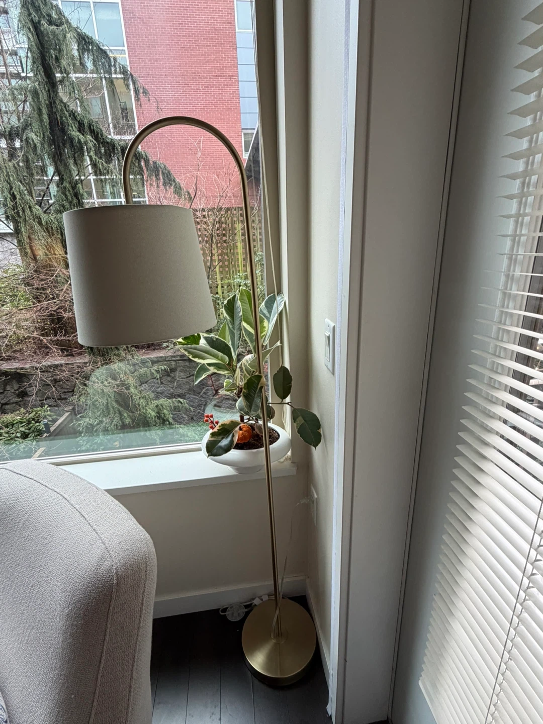 This is a brass arc floor lamp with a cream-coloured shade. It's a stylish addition to any room. The lamp has a sturdy circular base and an adjustable arm.