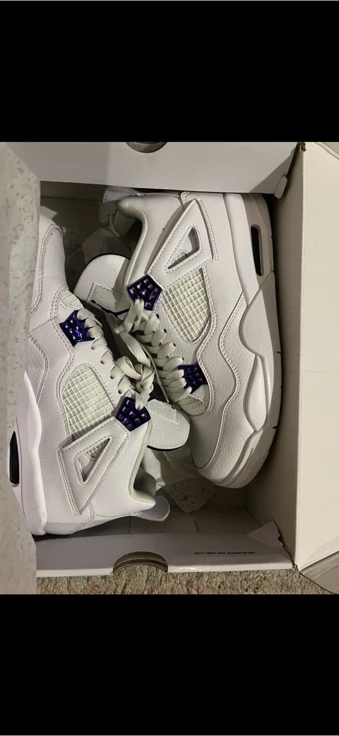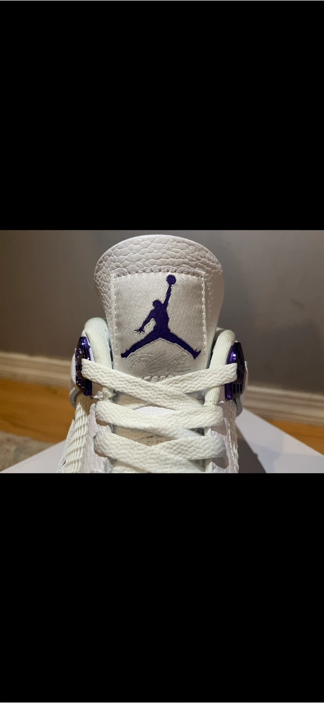 Classic Air Jordan 4 Retro sneakers in a white and purple colourway. Includes original box. Men's size 10.