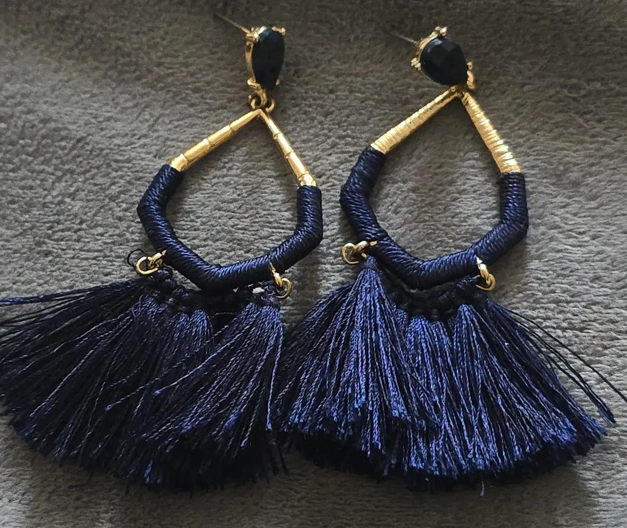 Navy Blue Tassel Earrings with Gold Accents