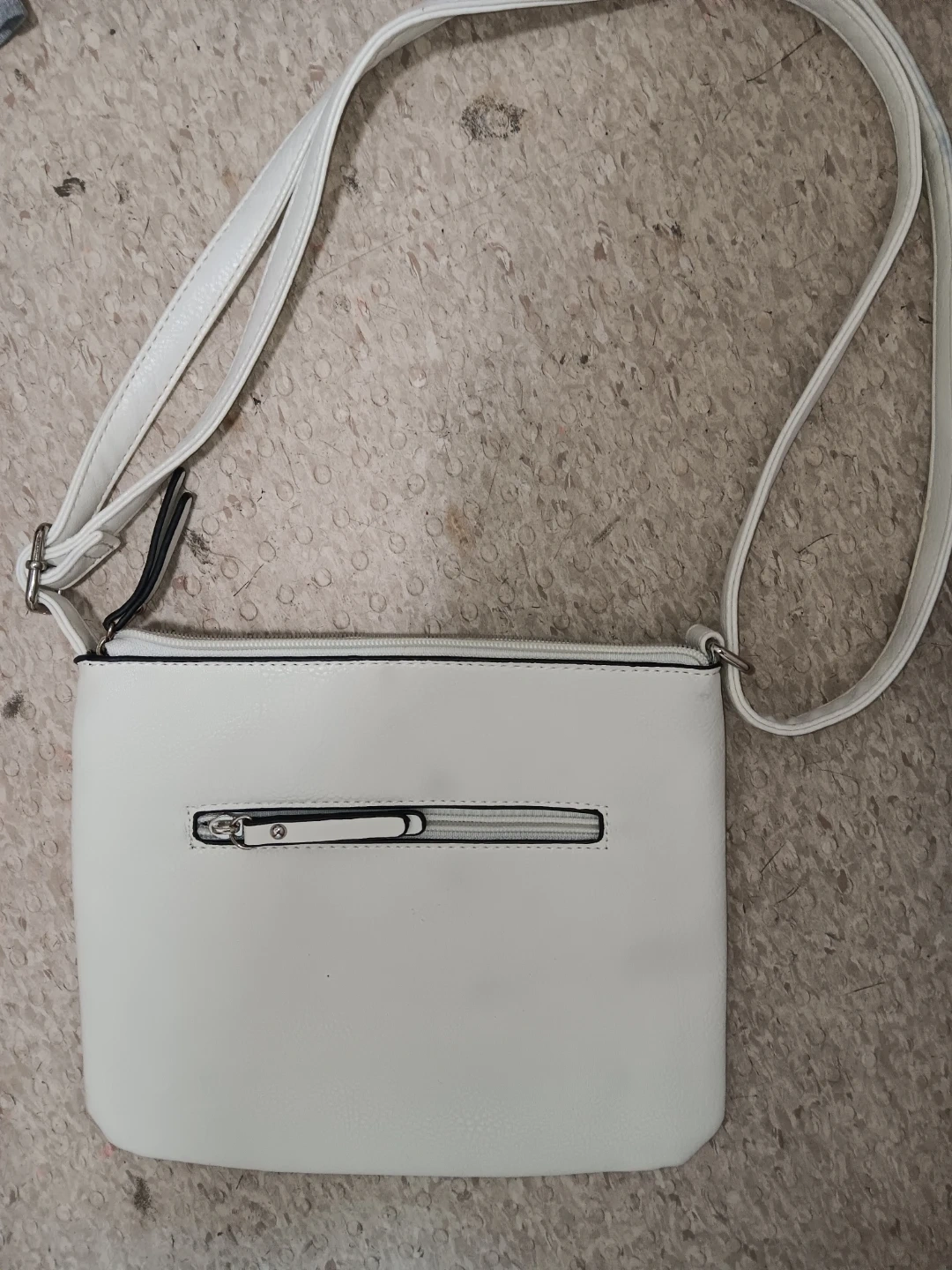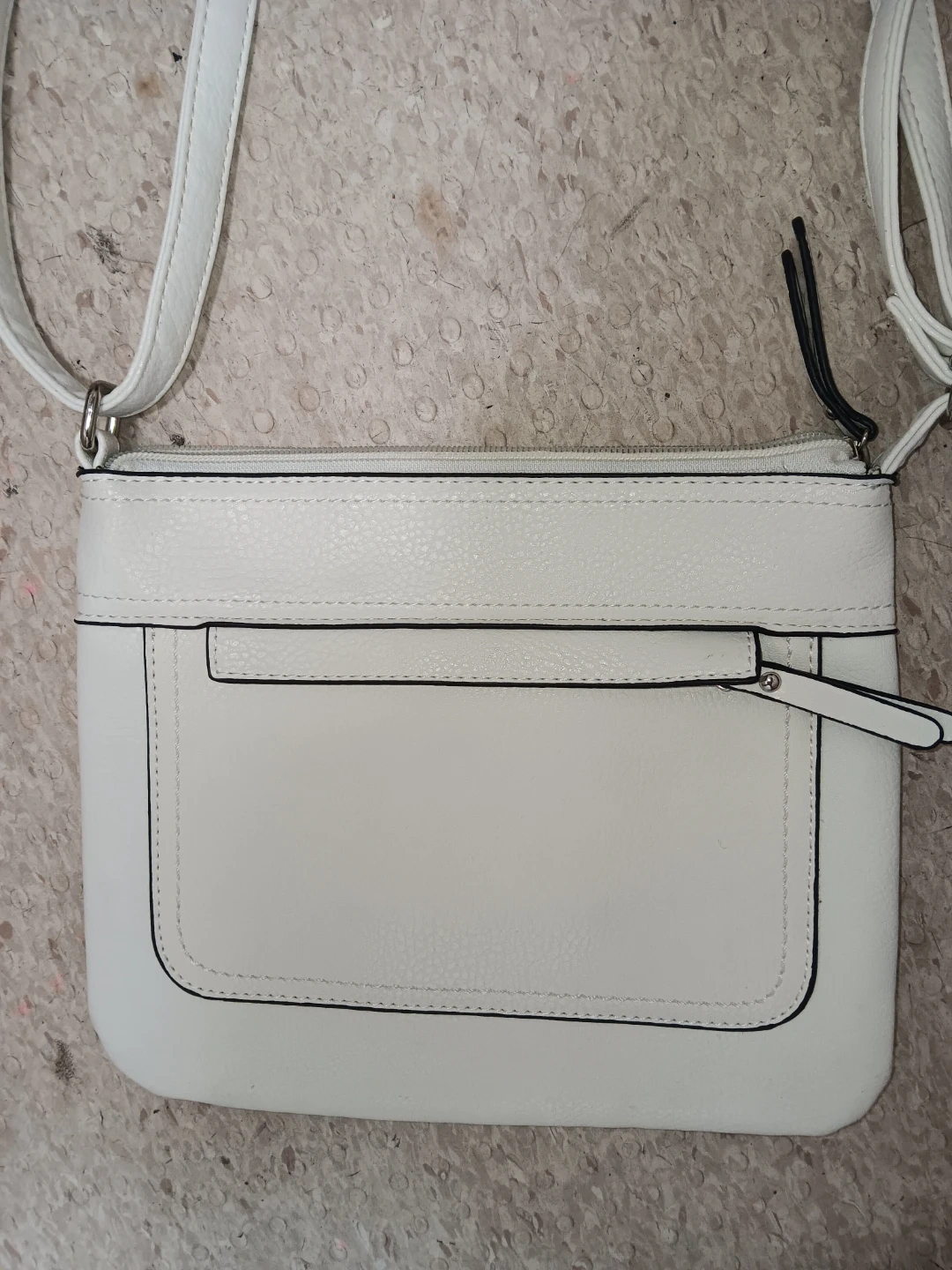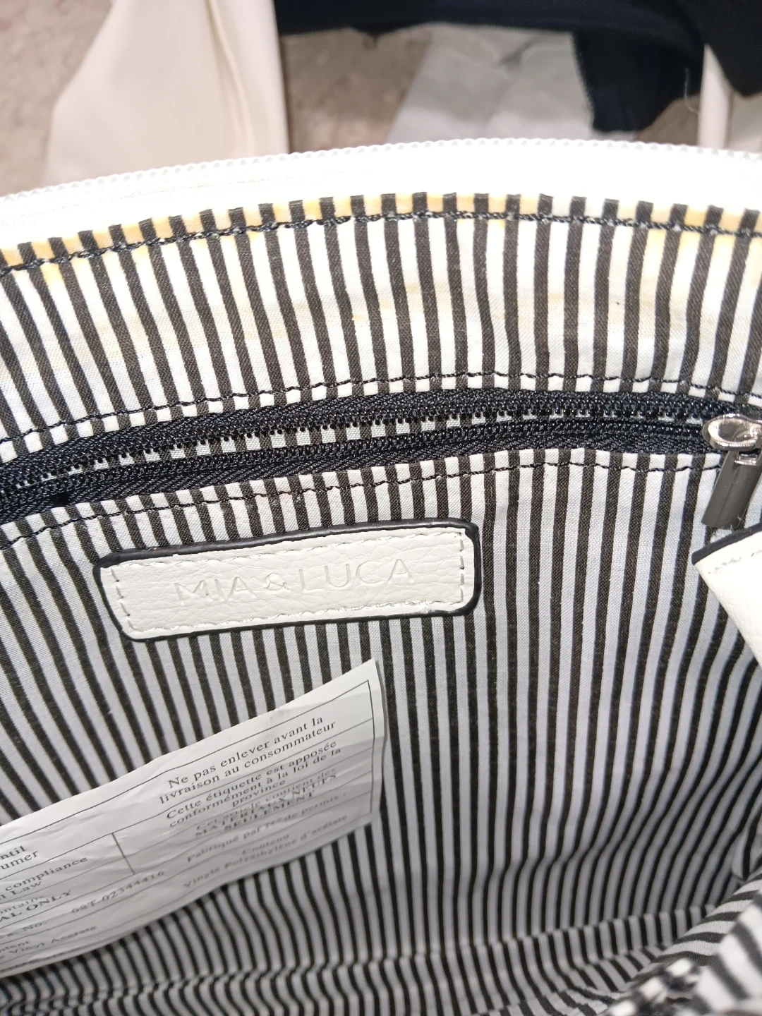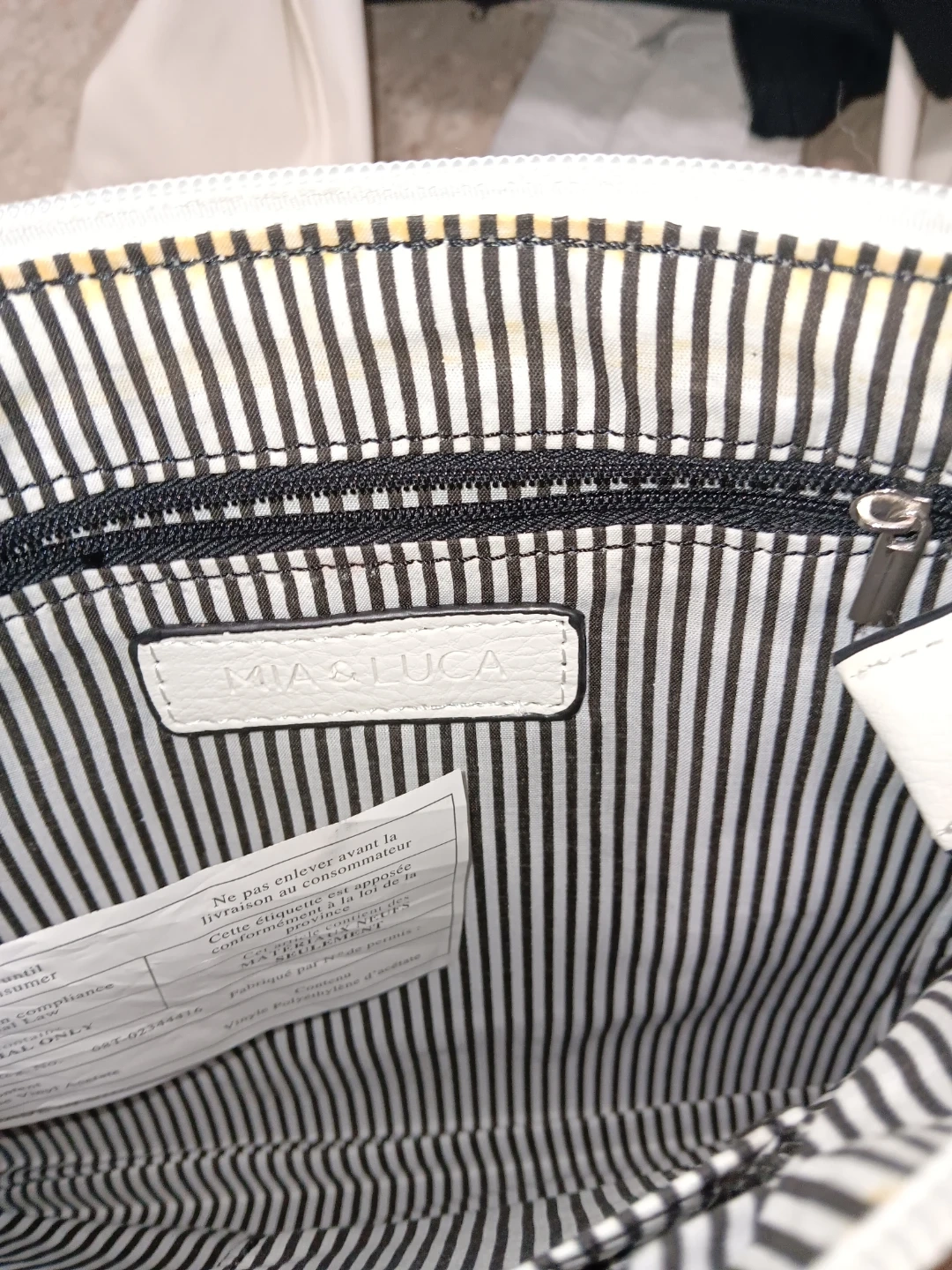 This is a white Mia & Luca crossbody purse. It's made of faux leather with a striped interior lining. Features include a zip top closure and a front pocket.
