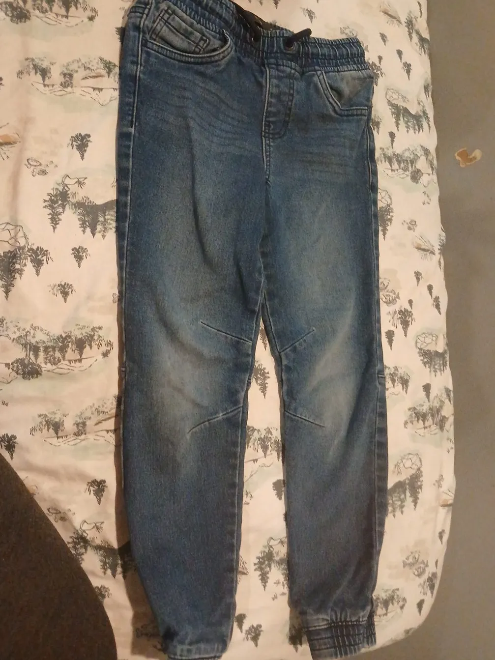 These are a pair of blue denim jogger pants. They appear to be in good condition and have an elastic waistband with a drawstring. They also feature front pockets and a comfortable, relaxed fit