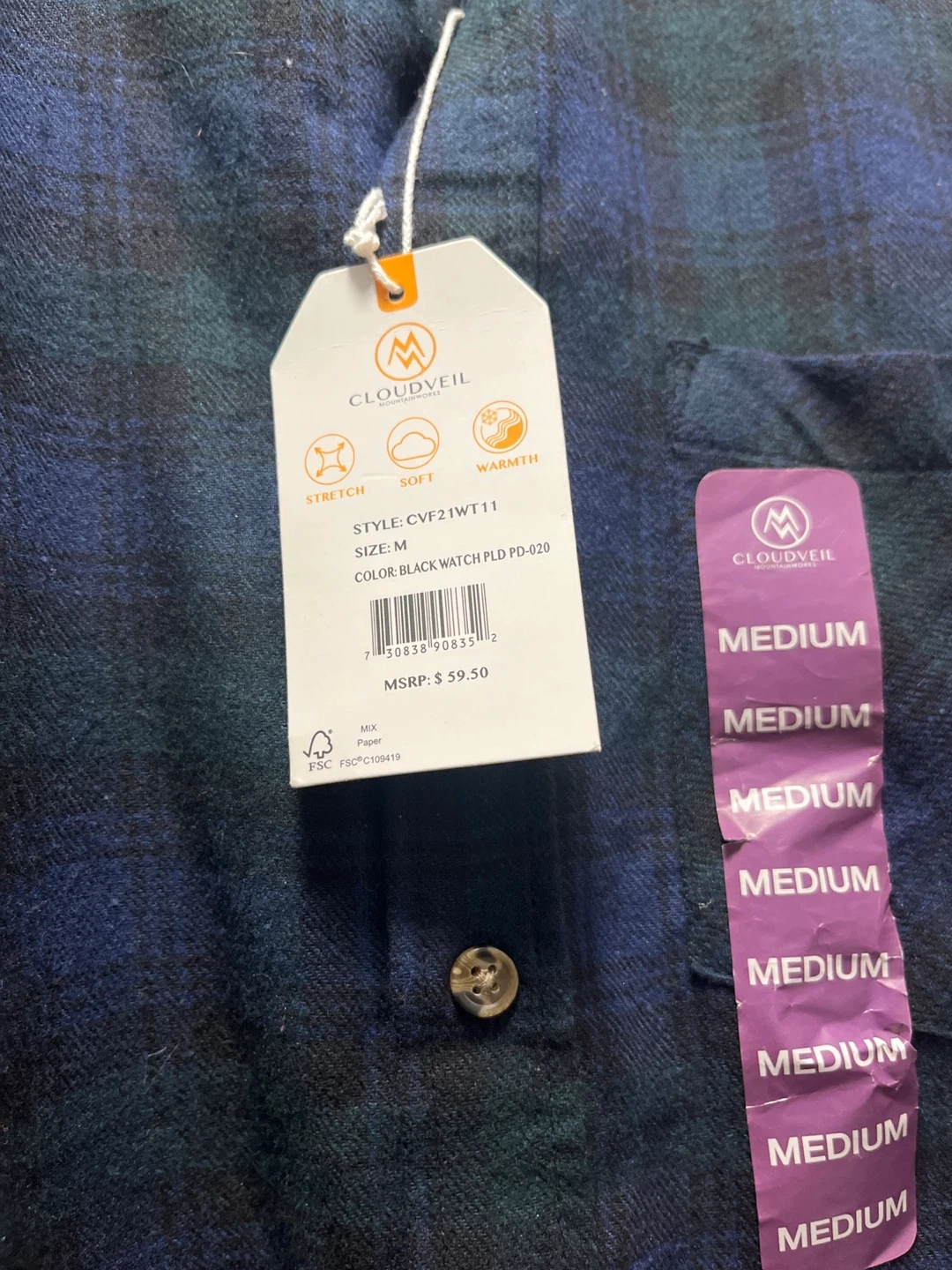 Cozy Cloudveil flannel shirt in size medium! This shirt is black watch plaid and is perfect for layering or wearing on its own. It's soft, stretchy, and warm. Originally bought for $59.50