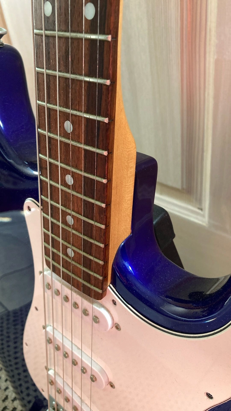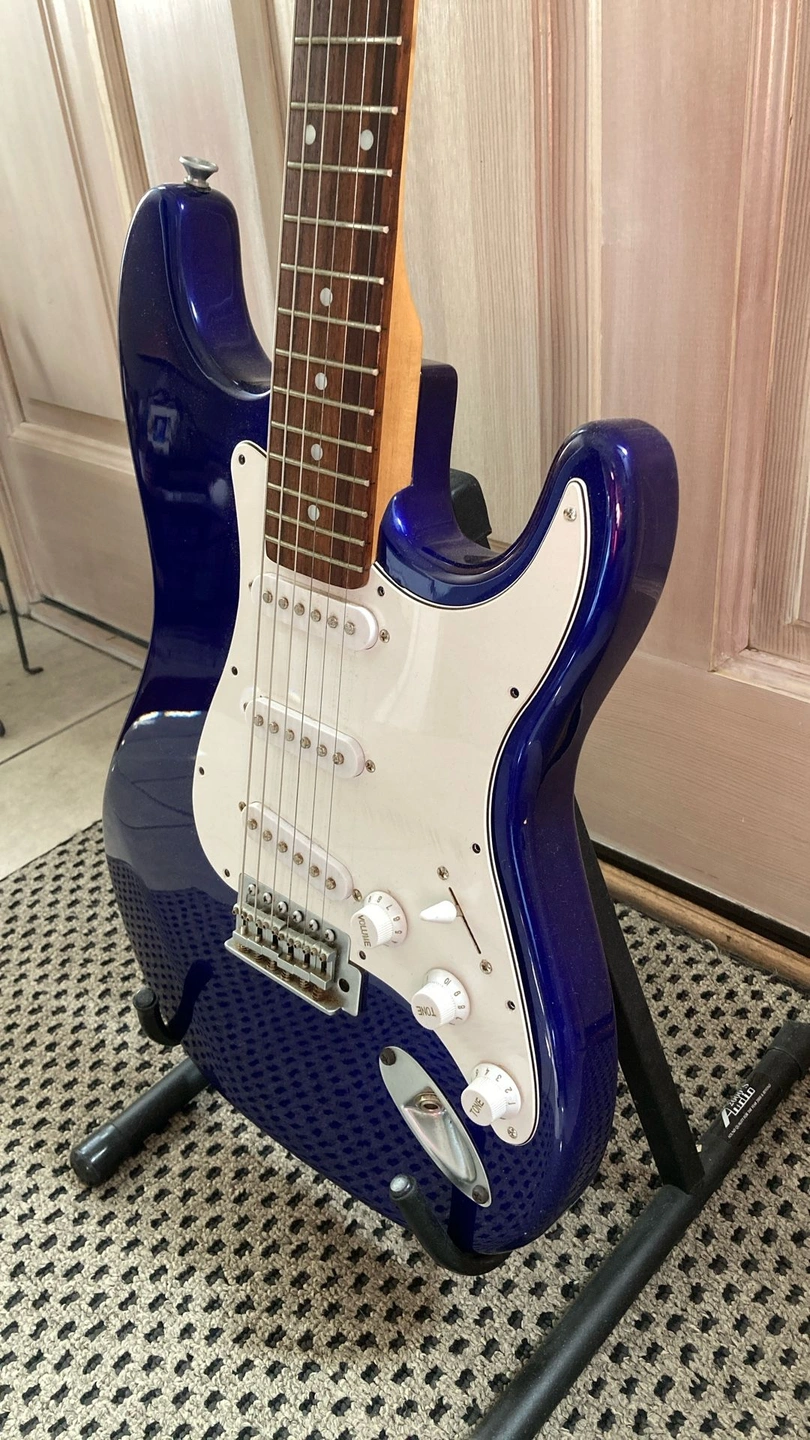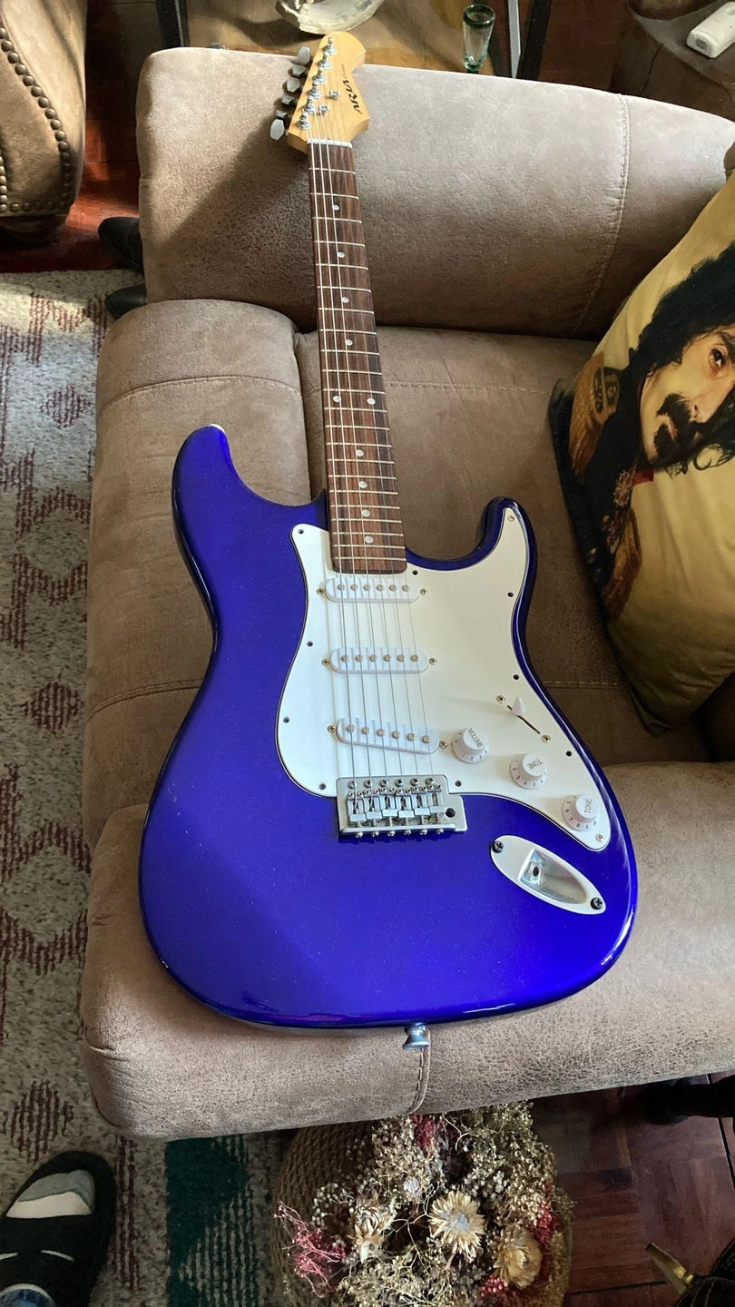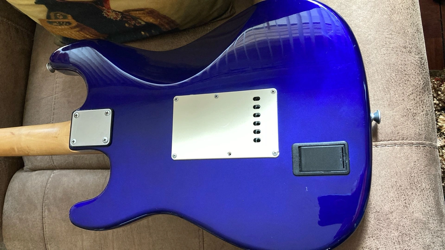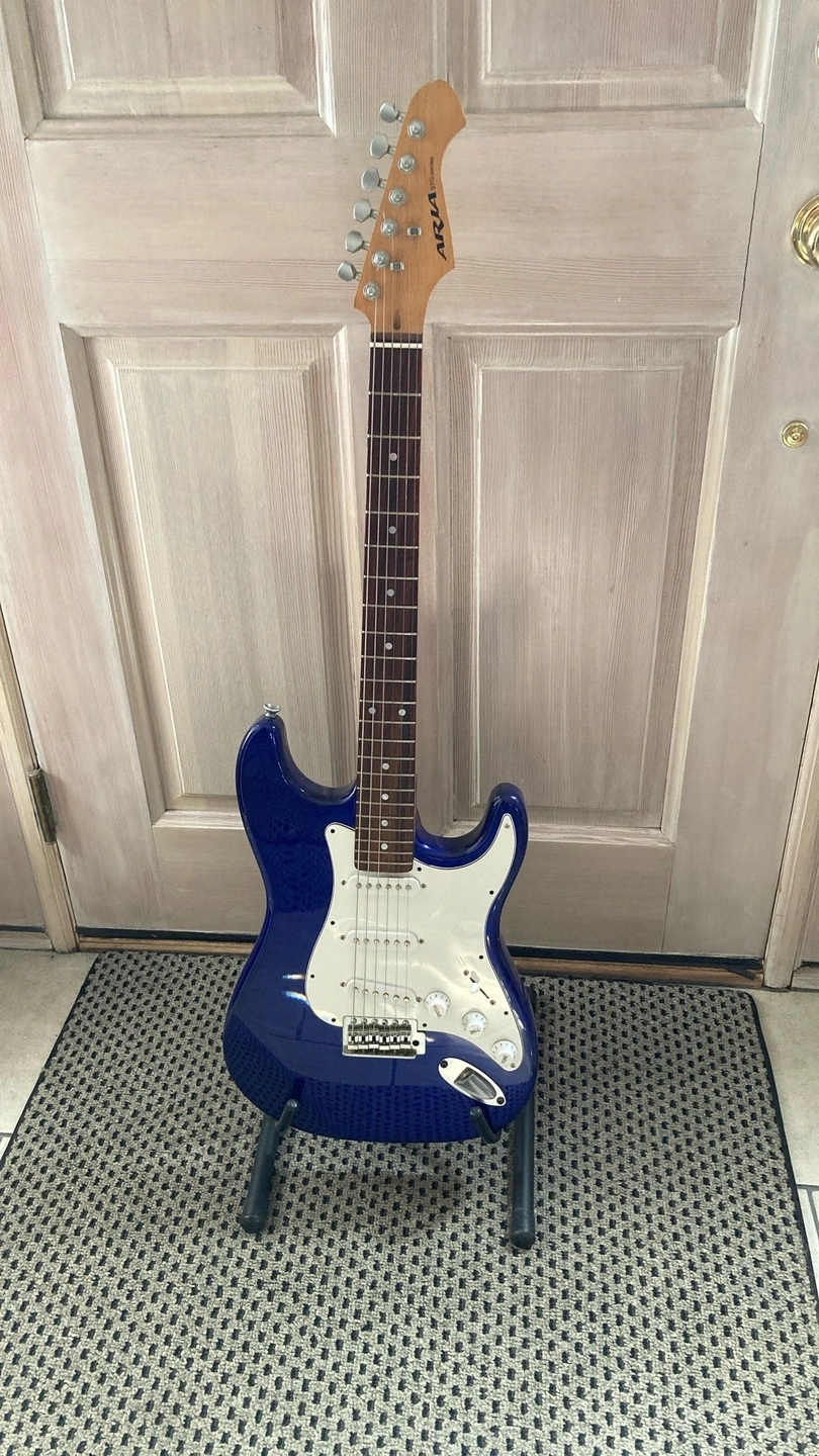 Very clean vintage guitar, plays well with a nice Rosewood Fretboard. Deluxe model with matte chrome hardware and Rosewood fretboard. Cool blue metallic finish that turns dark or to a purple blue in the light. Guitar trades considered. Body Color: Blue Metallic. Size: 4/4. Right-handed. Type: Electric. Brand: Aria.